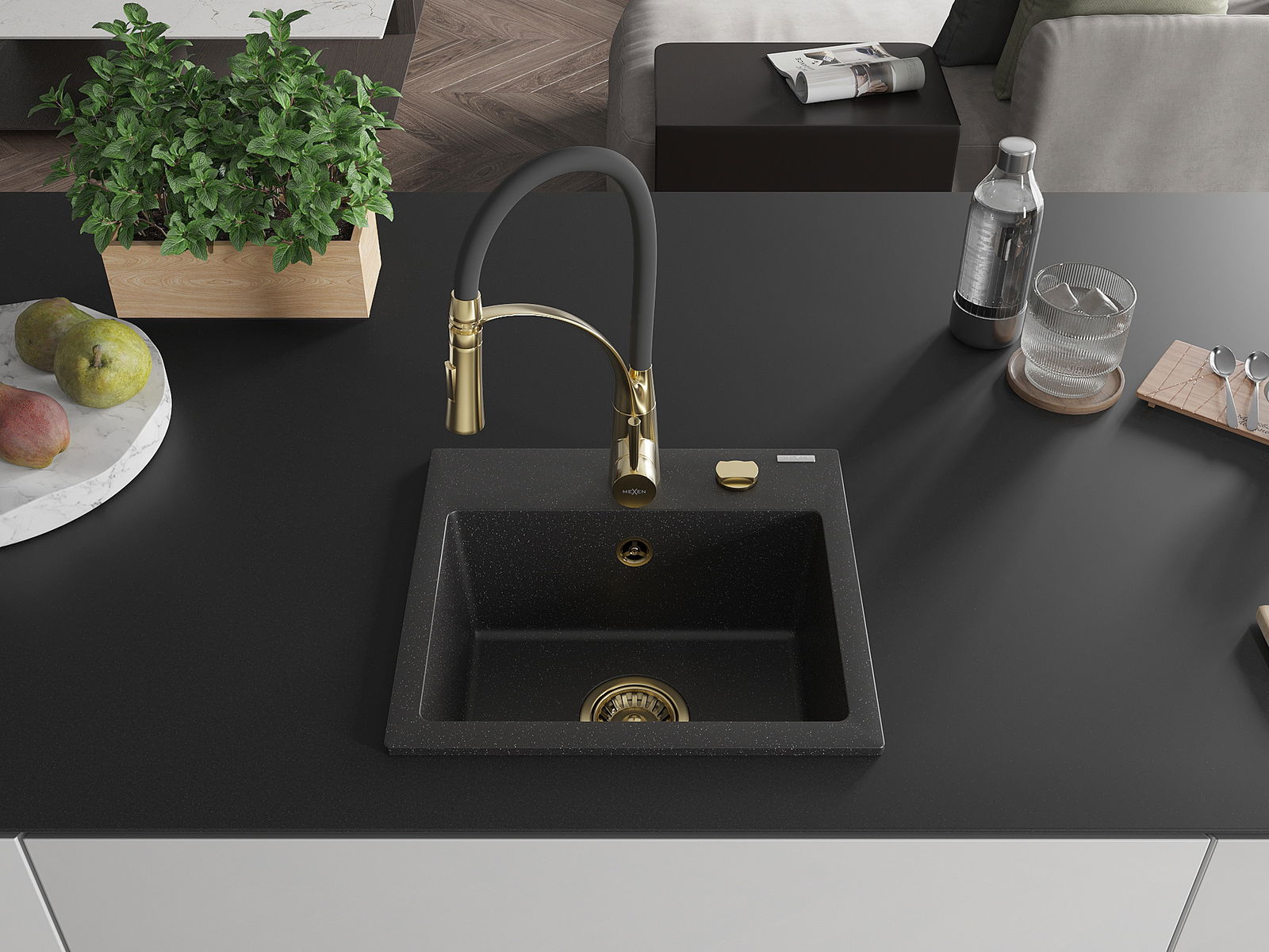 Mexen Milo žulový dřez s 1 komorou s kuchyňskou baterií Aster, černý/stříbrný metalik - 6505-73-73450-57-G