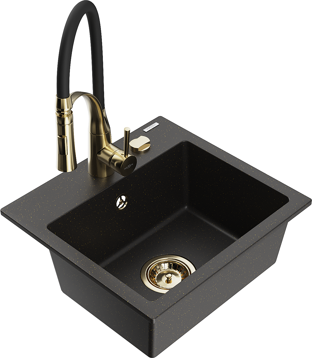Mexen Milo granitový dřez 1-komorový s kuchyňskou baterií Aster, černý/zlatý metalik - 6505-75-73450-57-G
