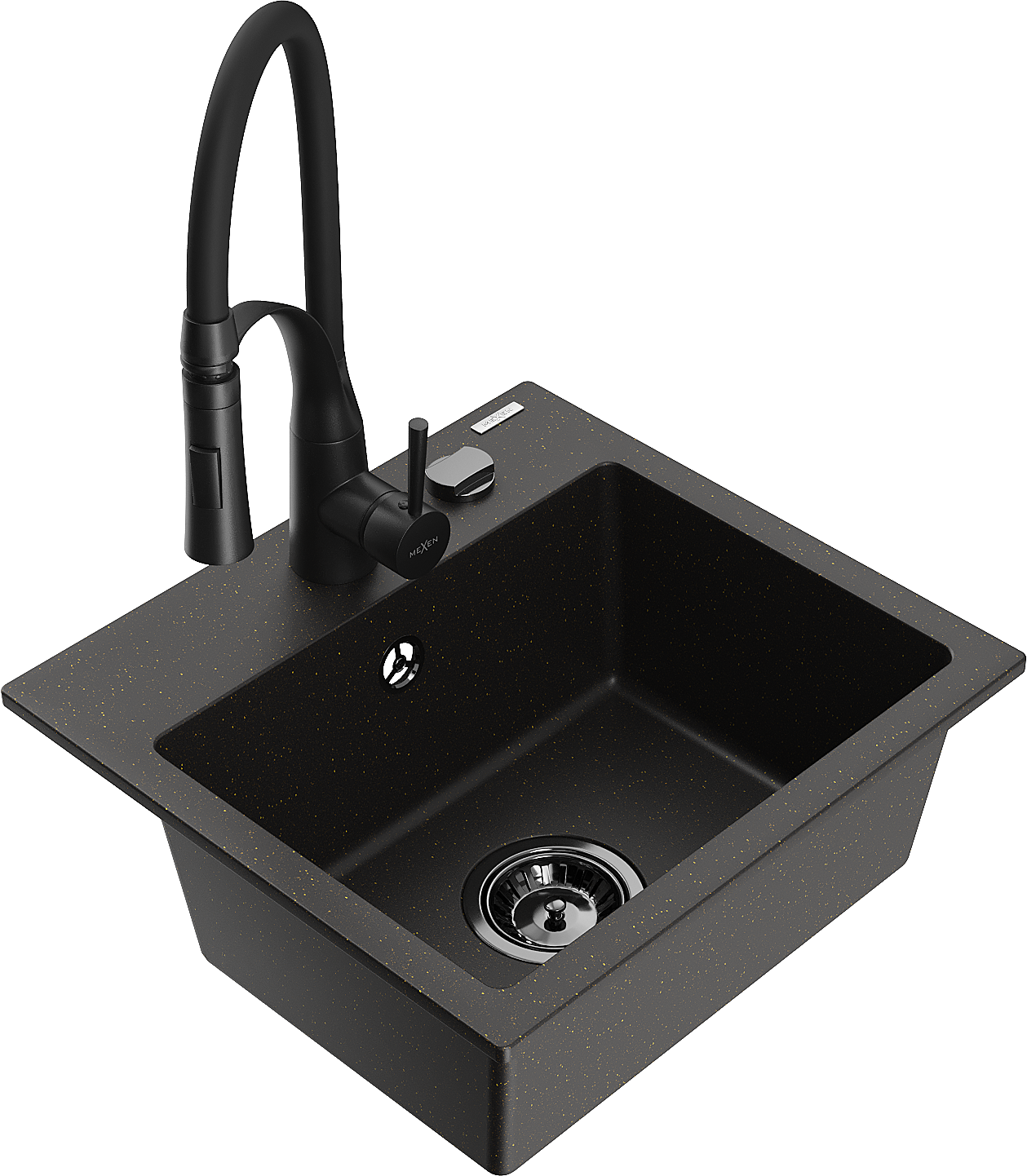 Mexen Milo granitový kuchyňský dřez 1-komorový s kuchyňskou baterií Aster, černý/zlatý metalický - 6505-75-73450-70-B