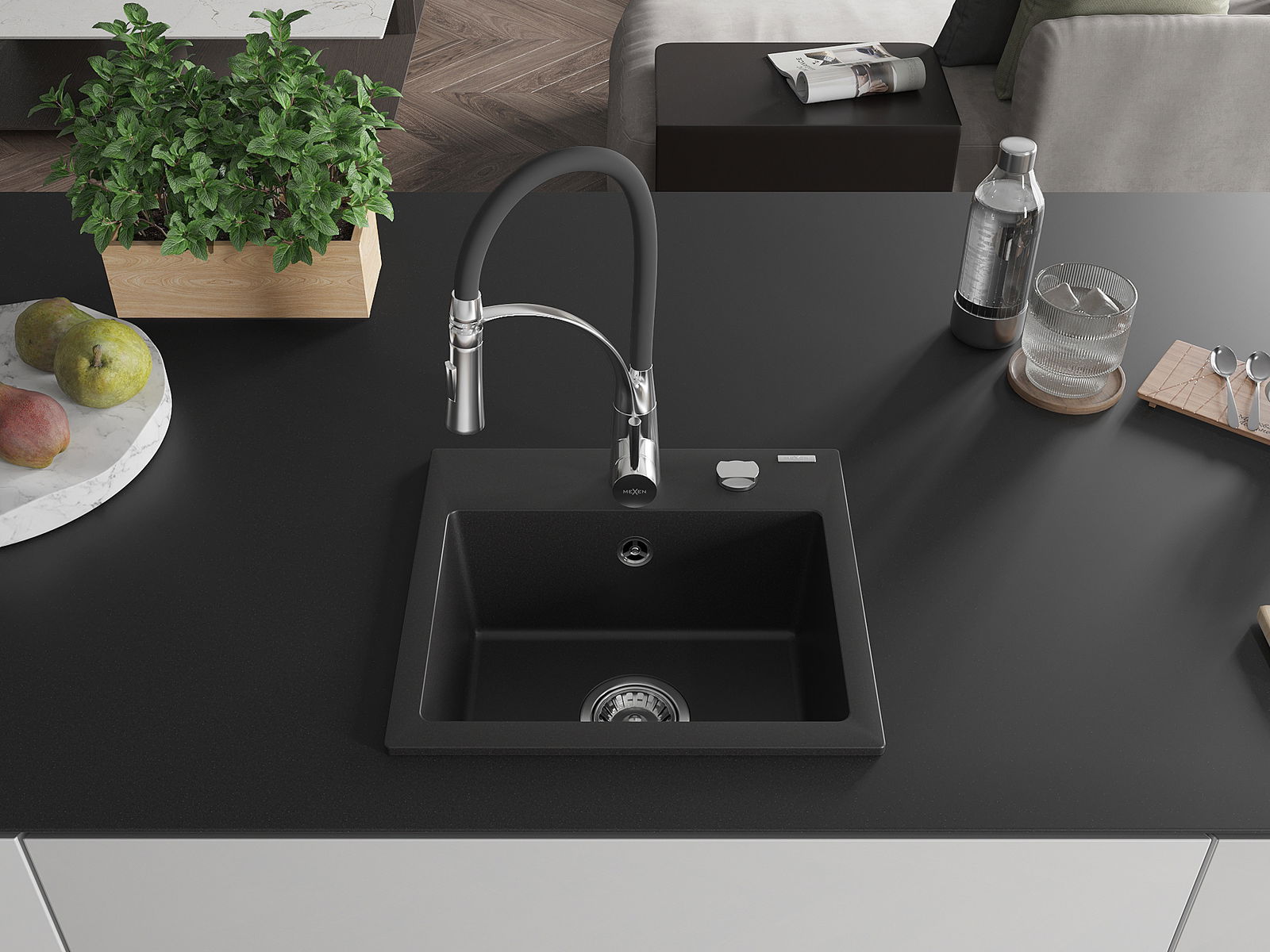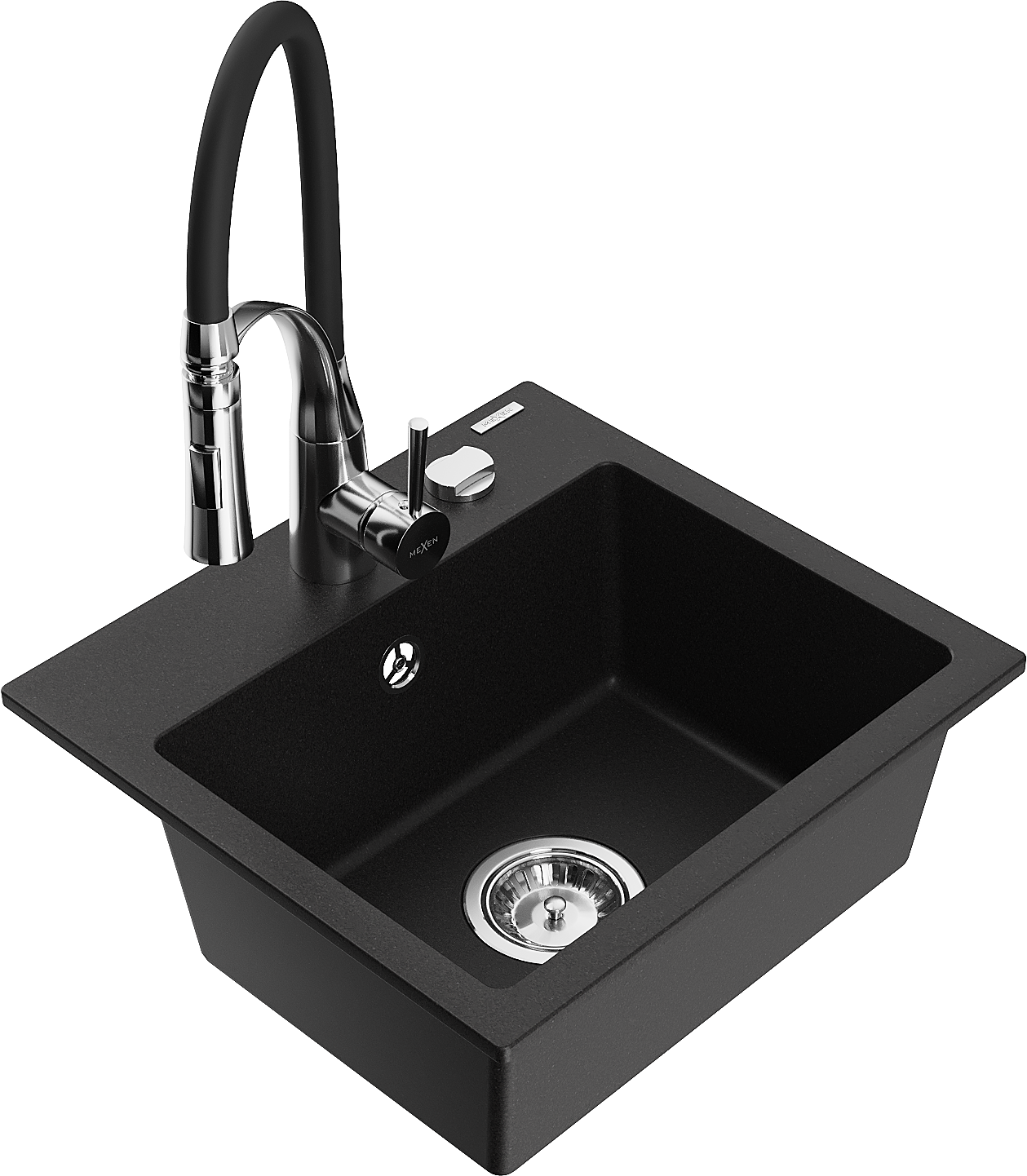 Mexen Milo granitový dřez 1-komorový s kuchyňskou baterií Aster, černý - 6505-77-73450-07