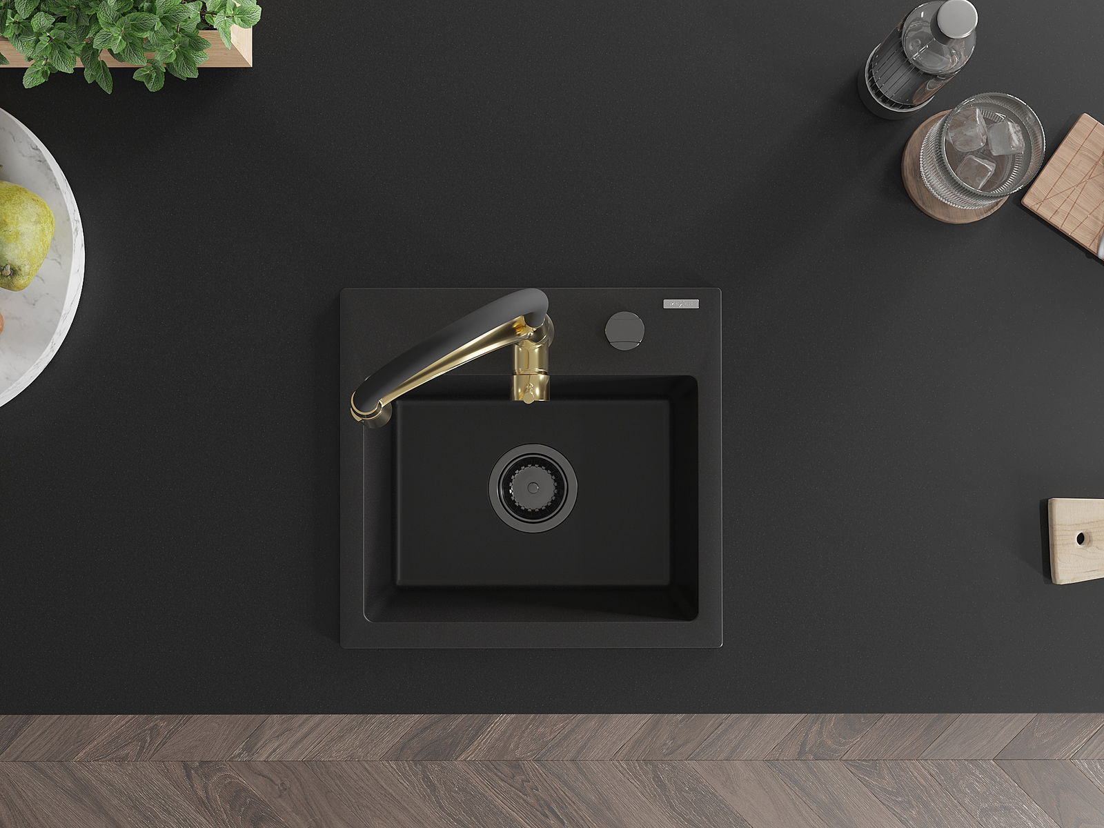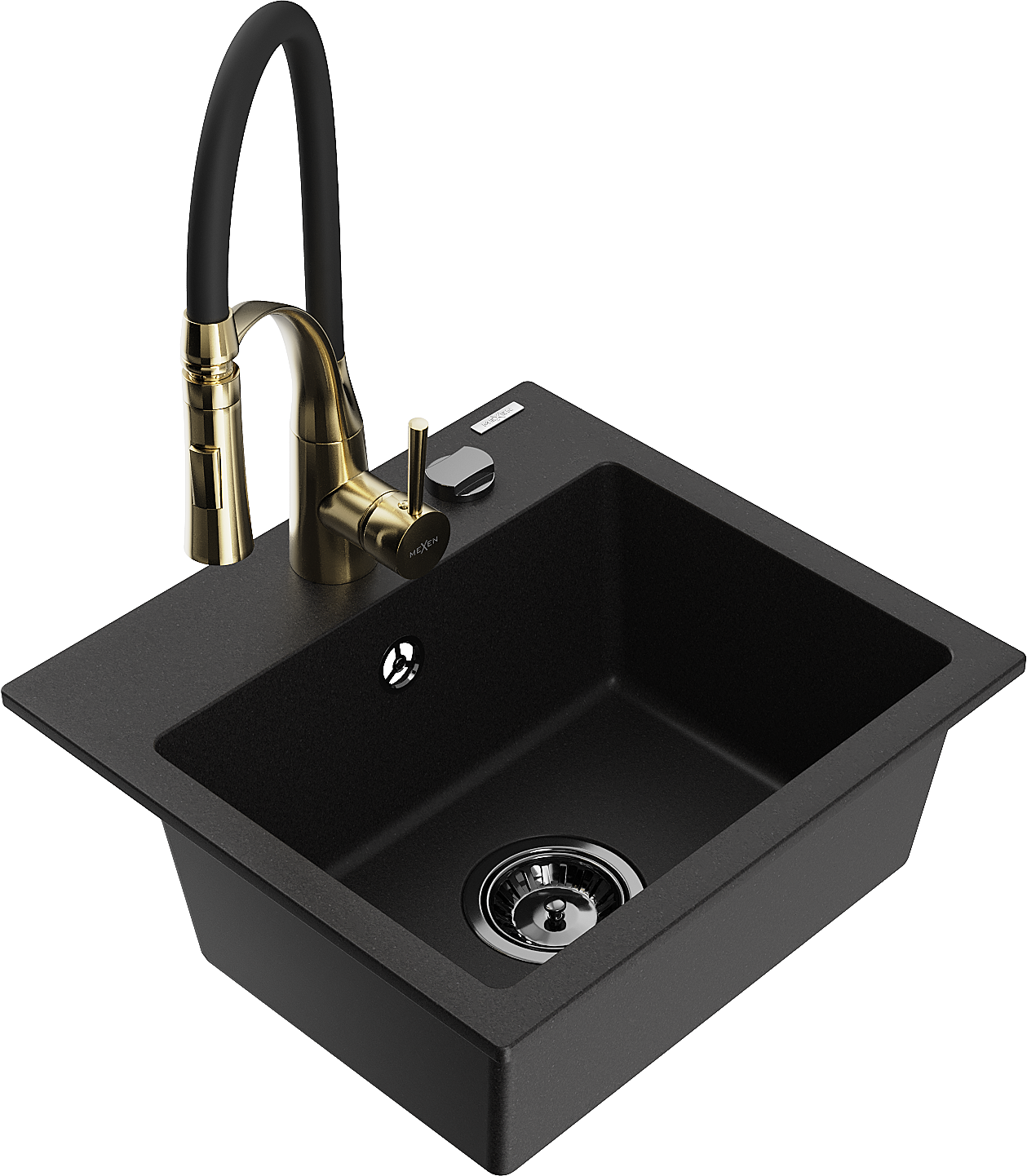 Mexen Milo granitový dřez 1-komorový s kuchyňskou baterií Aster, černý - 6505-77-73450-57-B