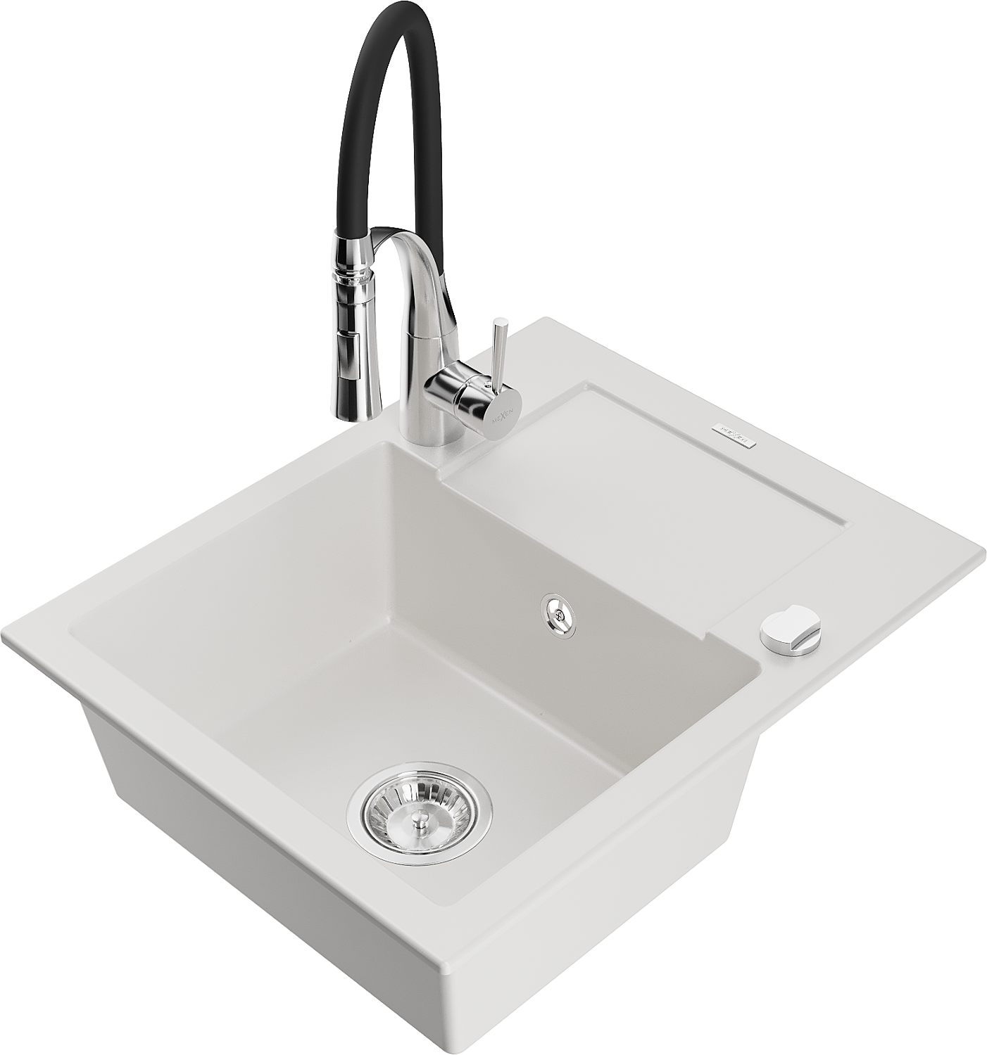 Mexen Enzo granitový dřez s 1 komorou, odkapávačem a kuchyňskou baterií Aster, bílý - 6506-20-73450-07