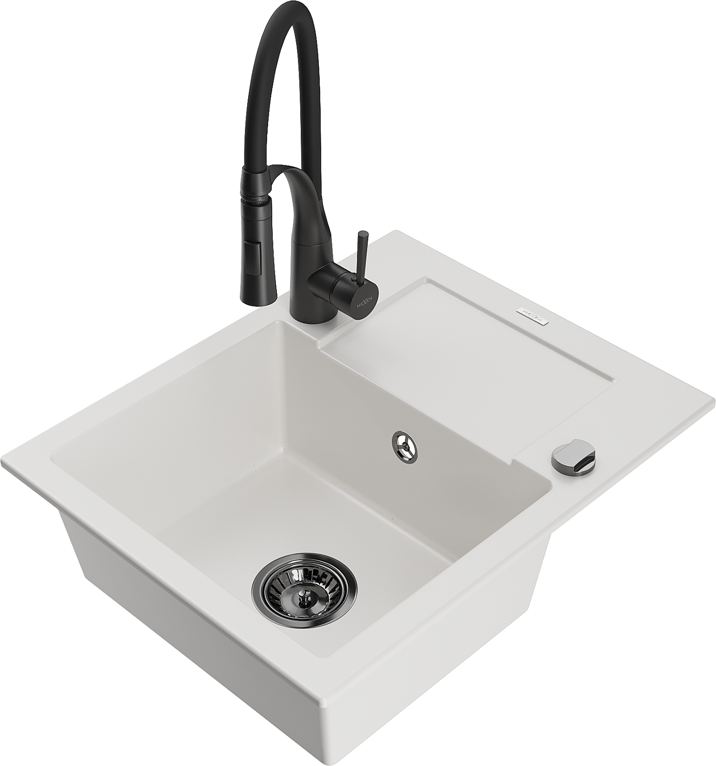 Mexen Enzo granitový dřez 1-komorový s odkapávačem a kuchyňskou baterií Aster, bílý - 6506-20-73450-70-B