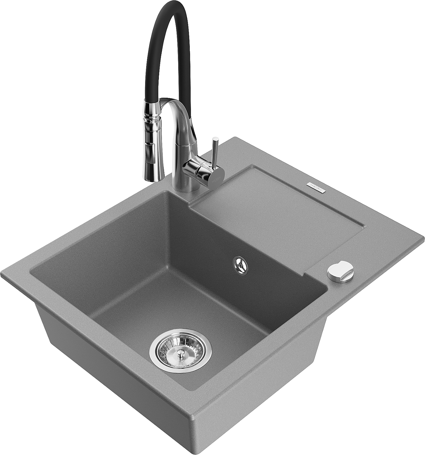 Mexen Enzo granitový dřez 1-komorový s odkapávačem a kuchyňskou baterií Aster, šedý - 6506-71-73450-07