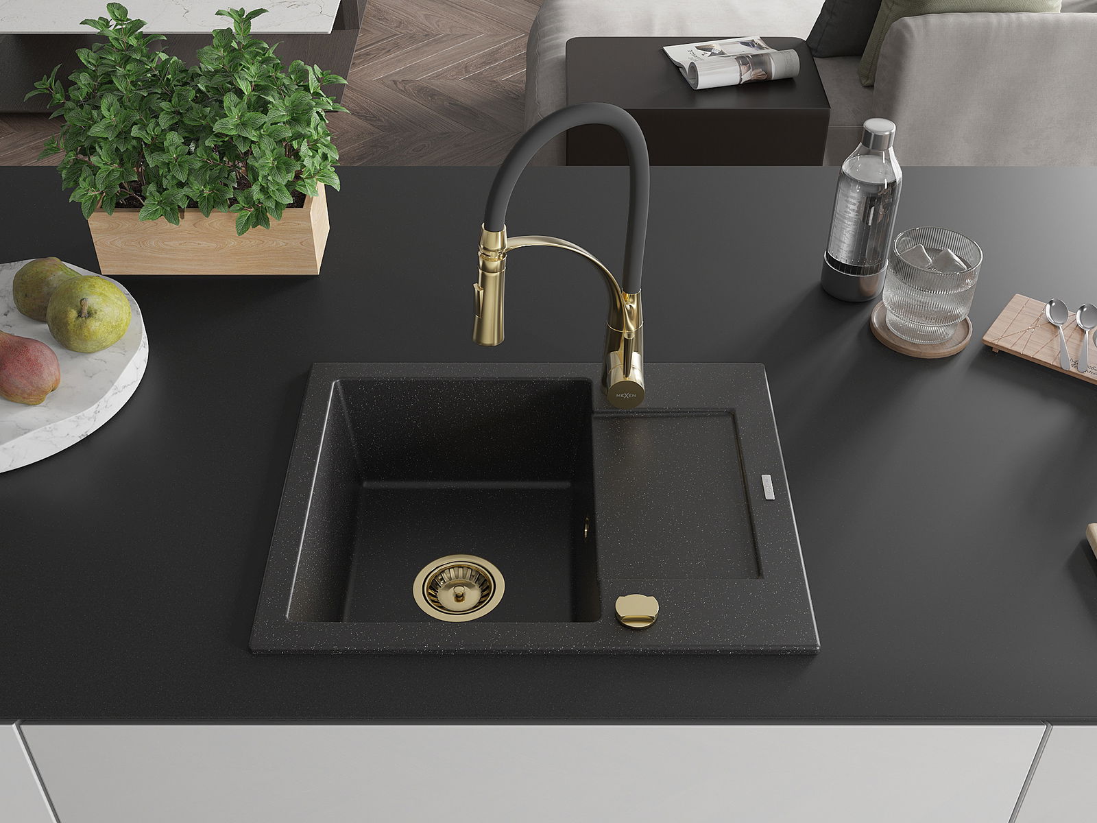 Mexen Enzo granitový dřez 1-komorový s odkapávačem a kuchyňskou baterií Aster, černý/stříbrný metalik - 6506-73-73450-57-G