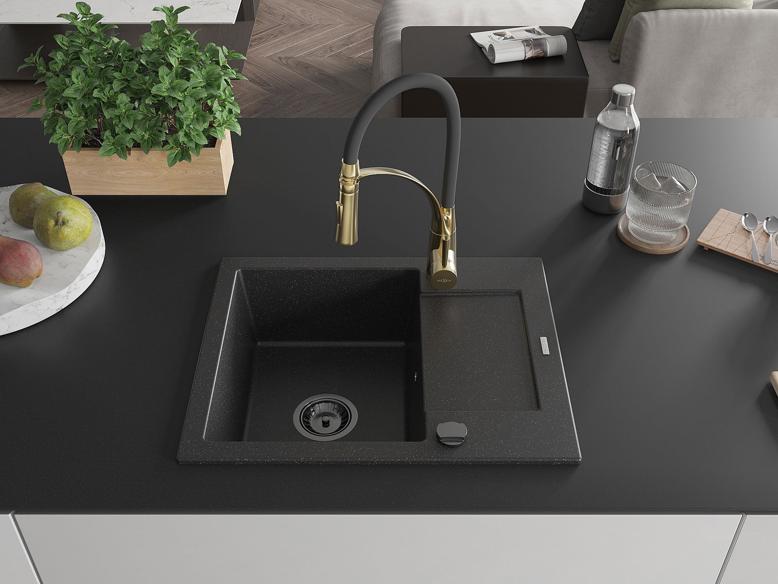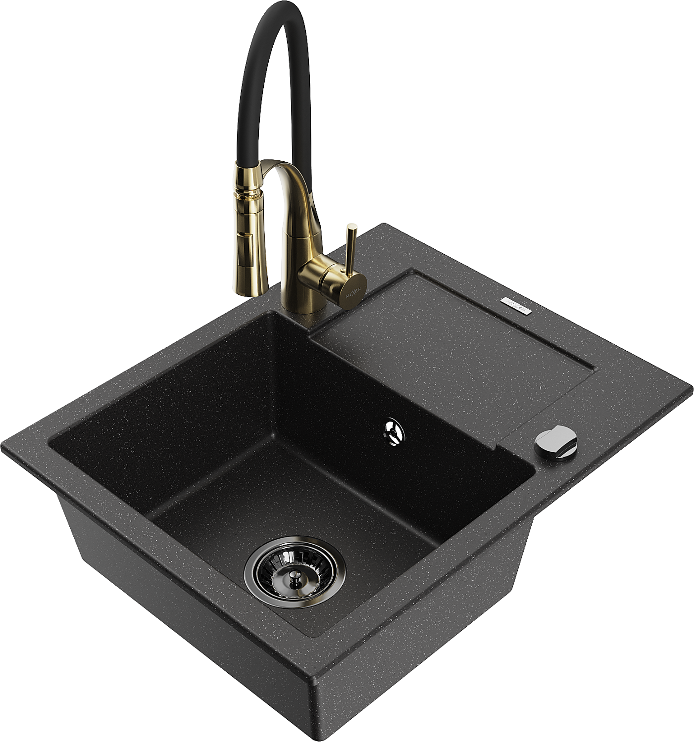 Mexen Enzo granitový dřez s 1 komorou a odkapávačem a kuchyňskou baterií Aster, černý/stříbrný metalický - 6506-73-73450-57-B