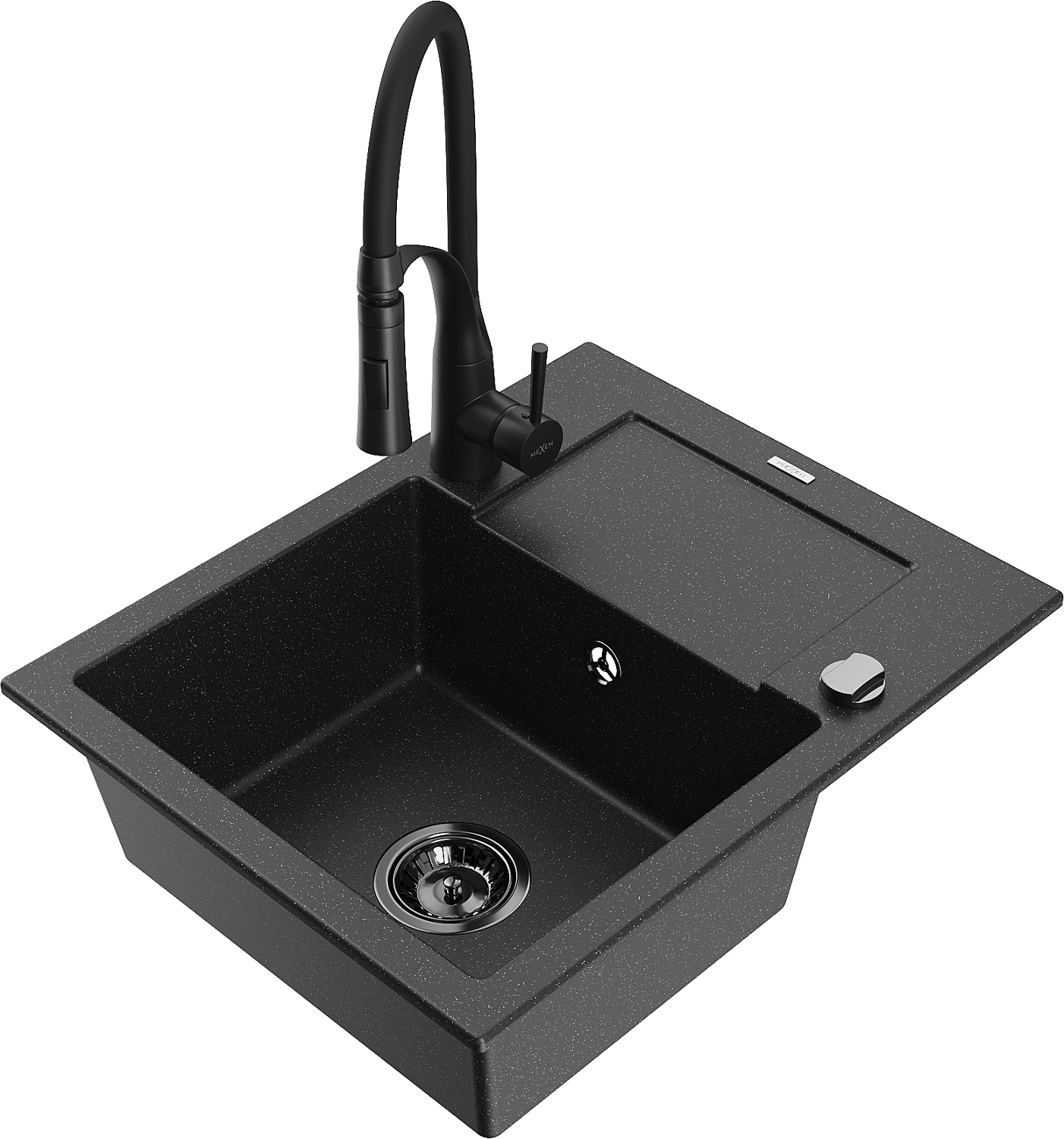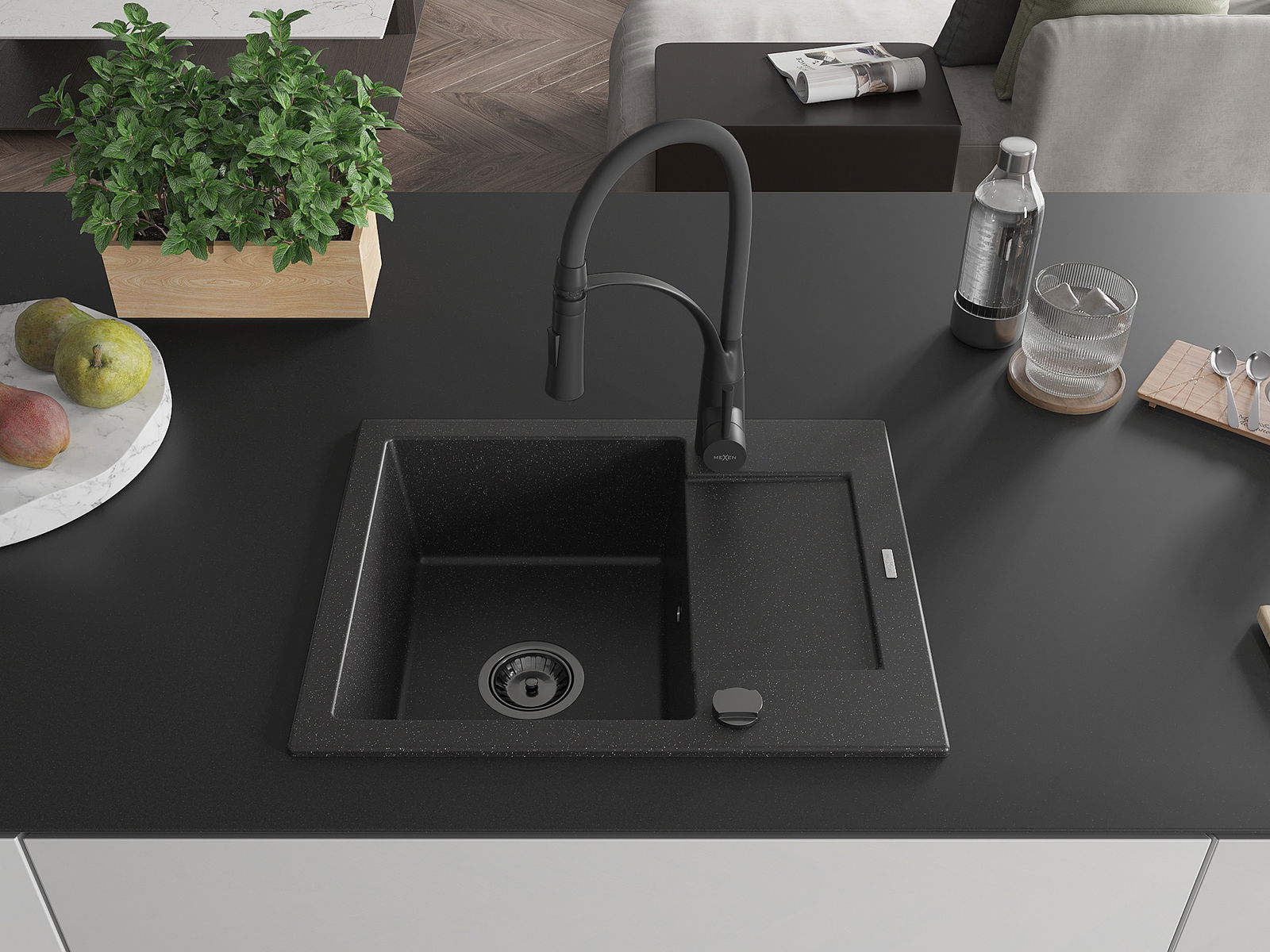 Mexen Enzo granitový dřez s 1 komorou a odkapávačem a kuchyňskou baterií Aster, černý/stříbrný metalik - 6506-73-73450-70-B