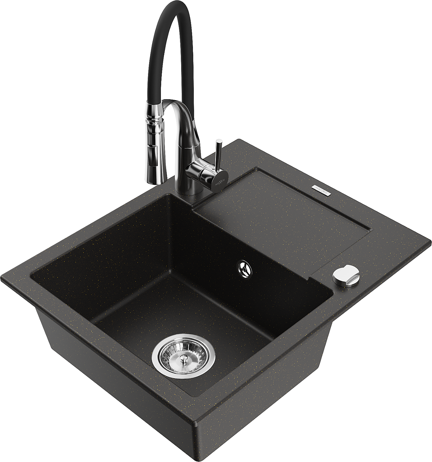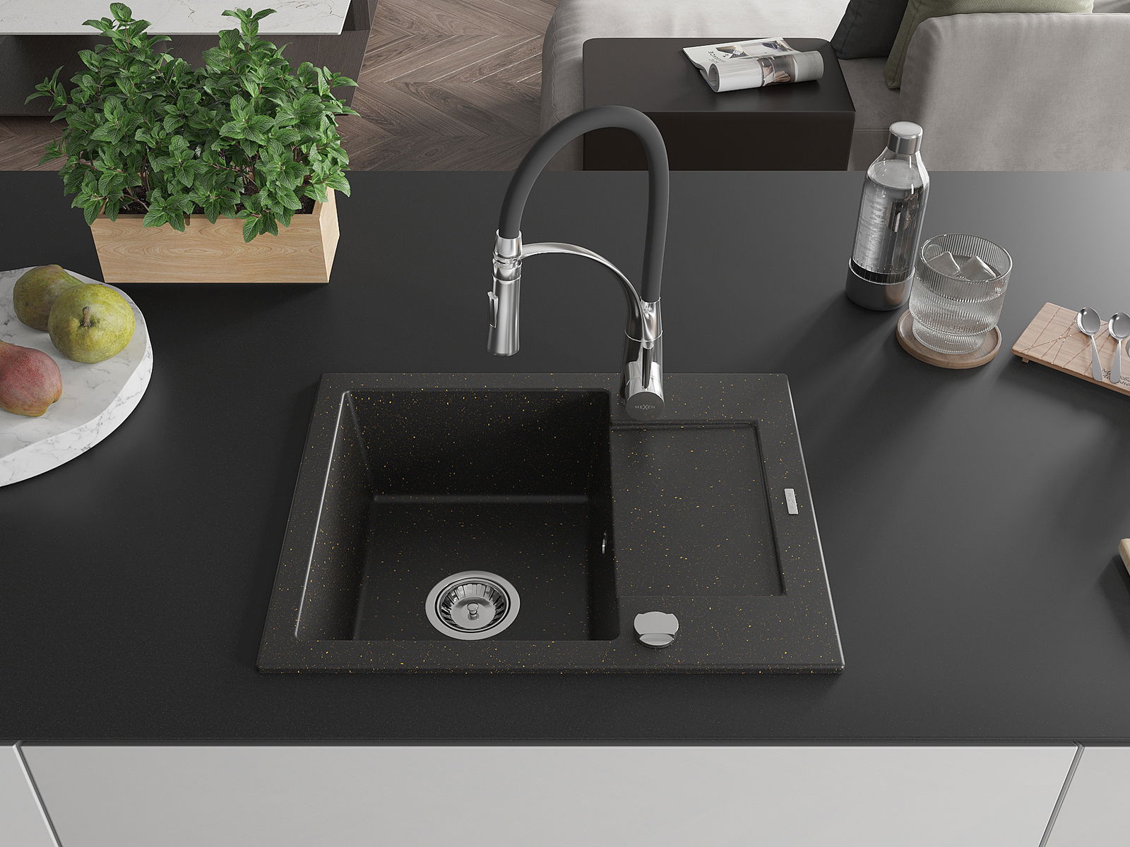 Mexen Enzo granitový dřez s 1 komorou a odkapávačem a kuchyňskou baterií Aster, černý/zlatý metalik - 6506-75-73450-07