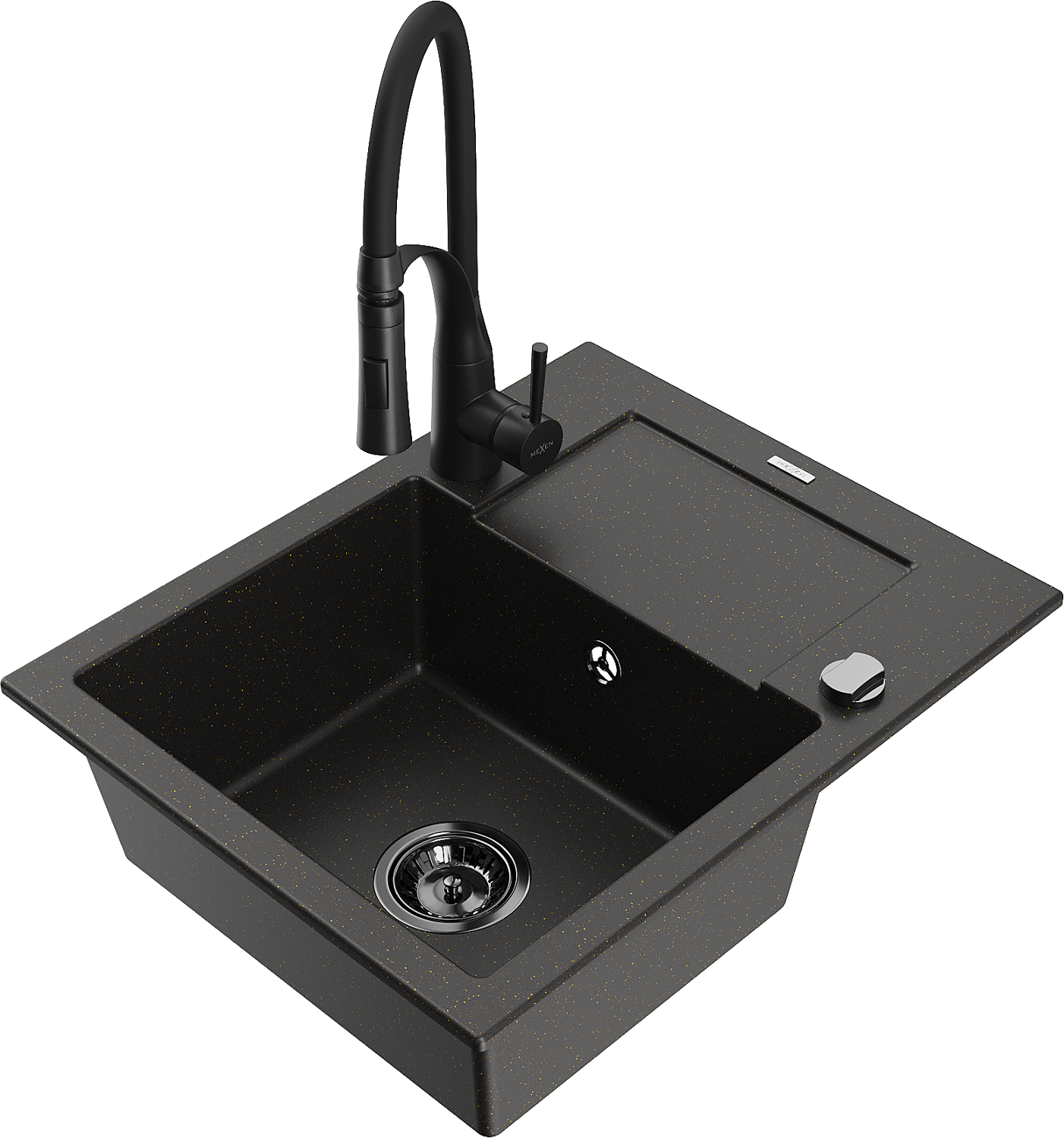 Mexen Enzo granitový dřez 1-komorový s odkapávačem a kuchyňskou baterií Aster, černý/zlatý metalic - 6506-75-73450-70-B
