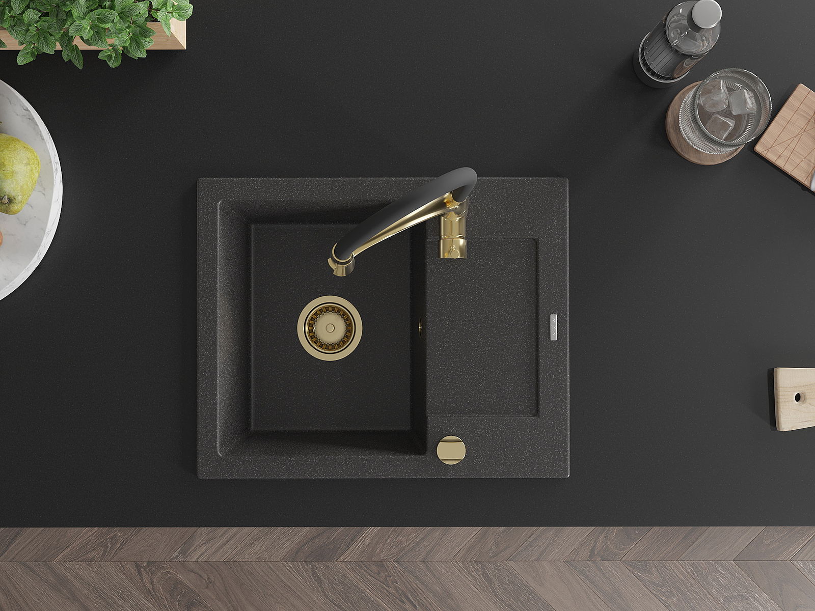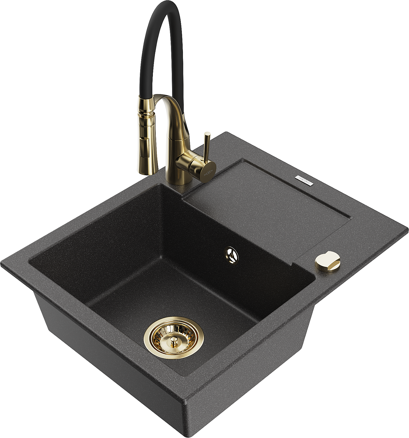 Mexen Enzo granitový dřez 1-komorový s odkapávačem a kuchyňskou baterií Aster, černý skvrnitý - 6506-76-73450-57-G