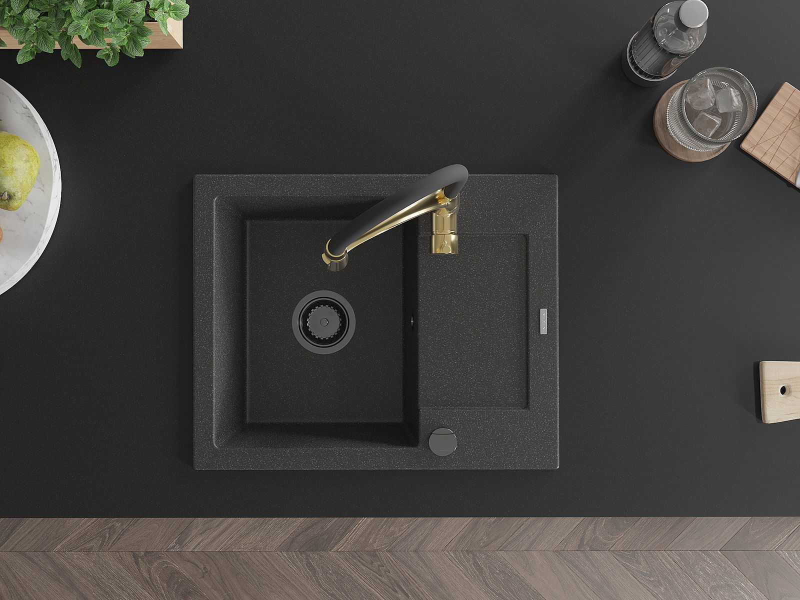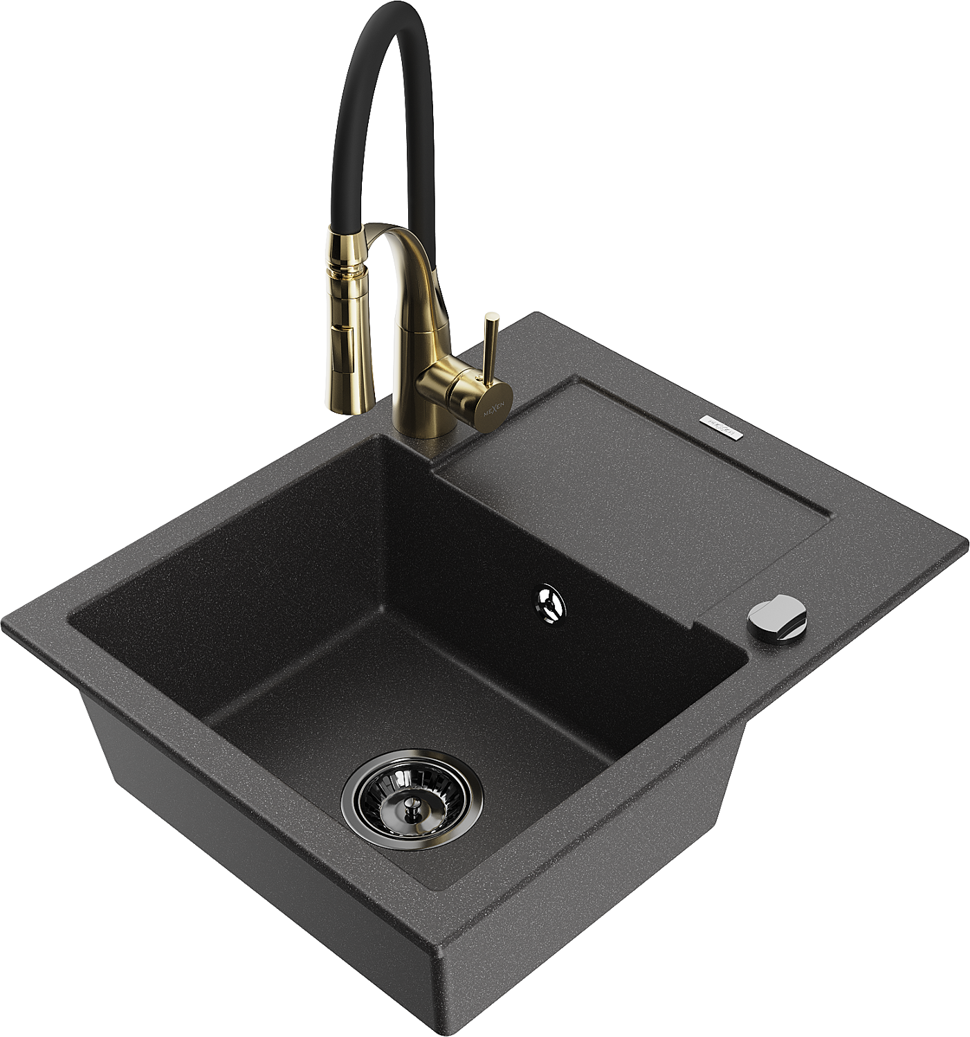 Mexen Enzo granitový dřez s jednou komorou s odkapávačem a kuchyňskou baterií Aster, černý tečkovaný - 6506-76-73450-57-B