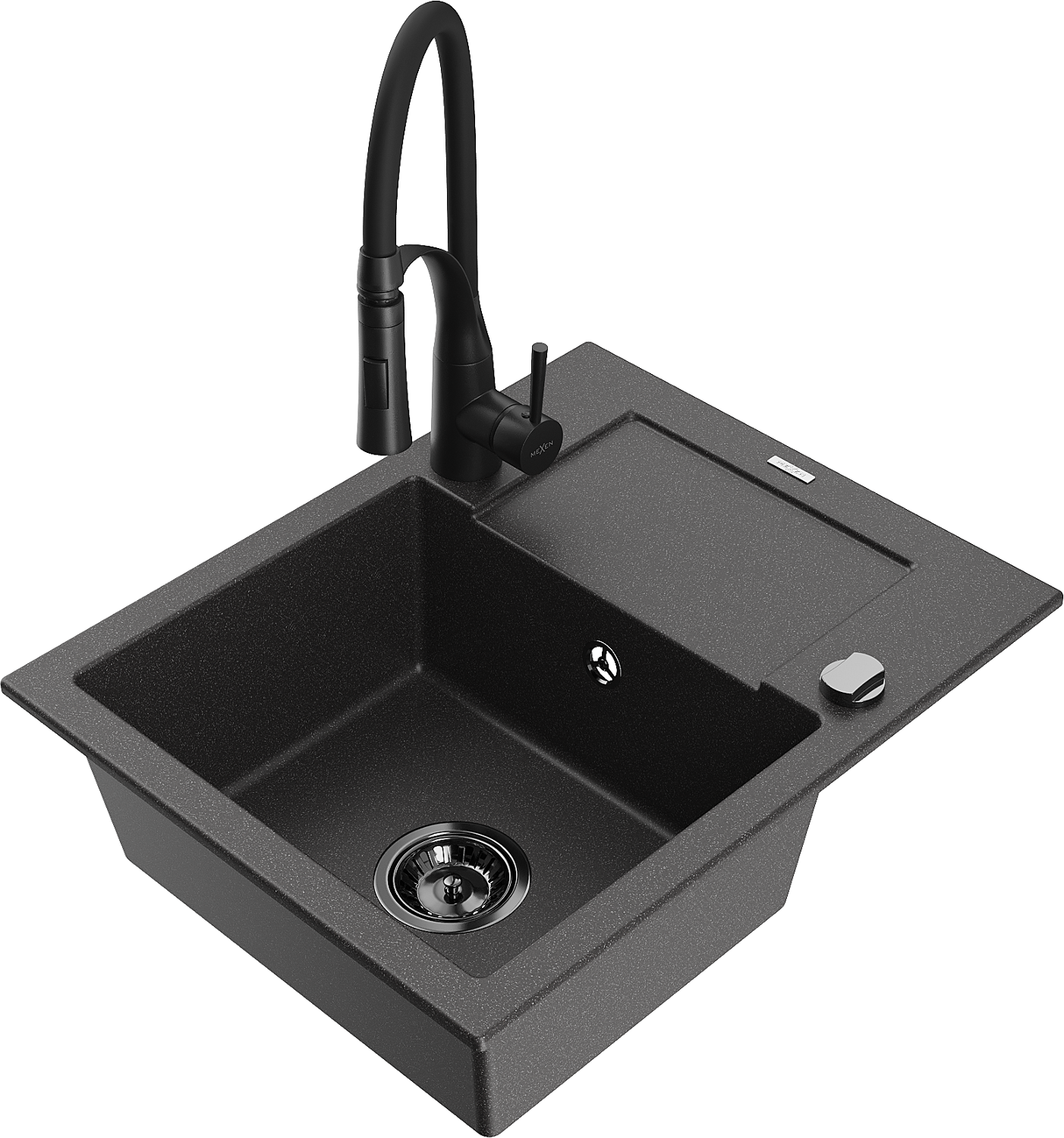 Mexen Enzo granitový dřez 1-komorový s odkapávačem a kuchyňskou baterií Aster, černý kropenatý - 6506-76-73450-70-B