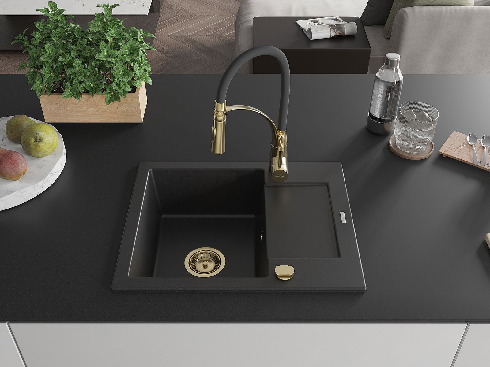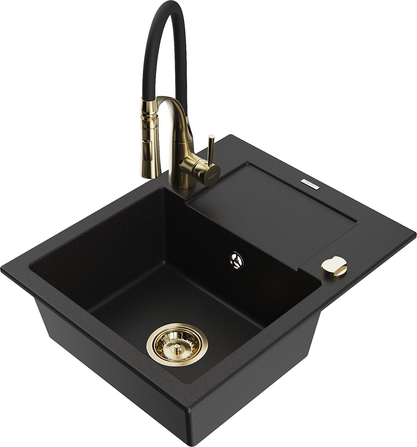 Mexen Enzo granitový dřez 1-komorový s odkapávačem a kuchyňskou baterií Aster, černý - 6506-77-73450-57-G
