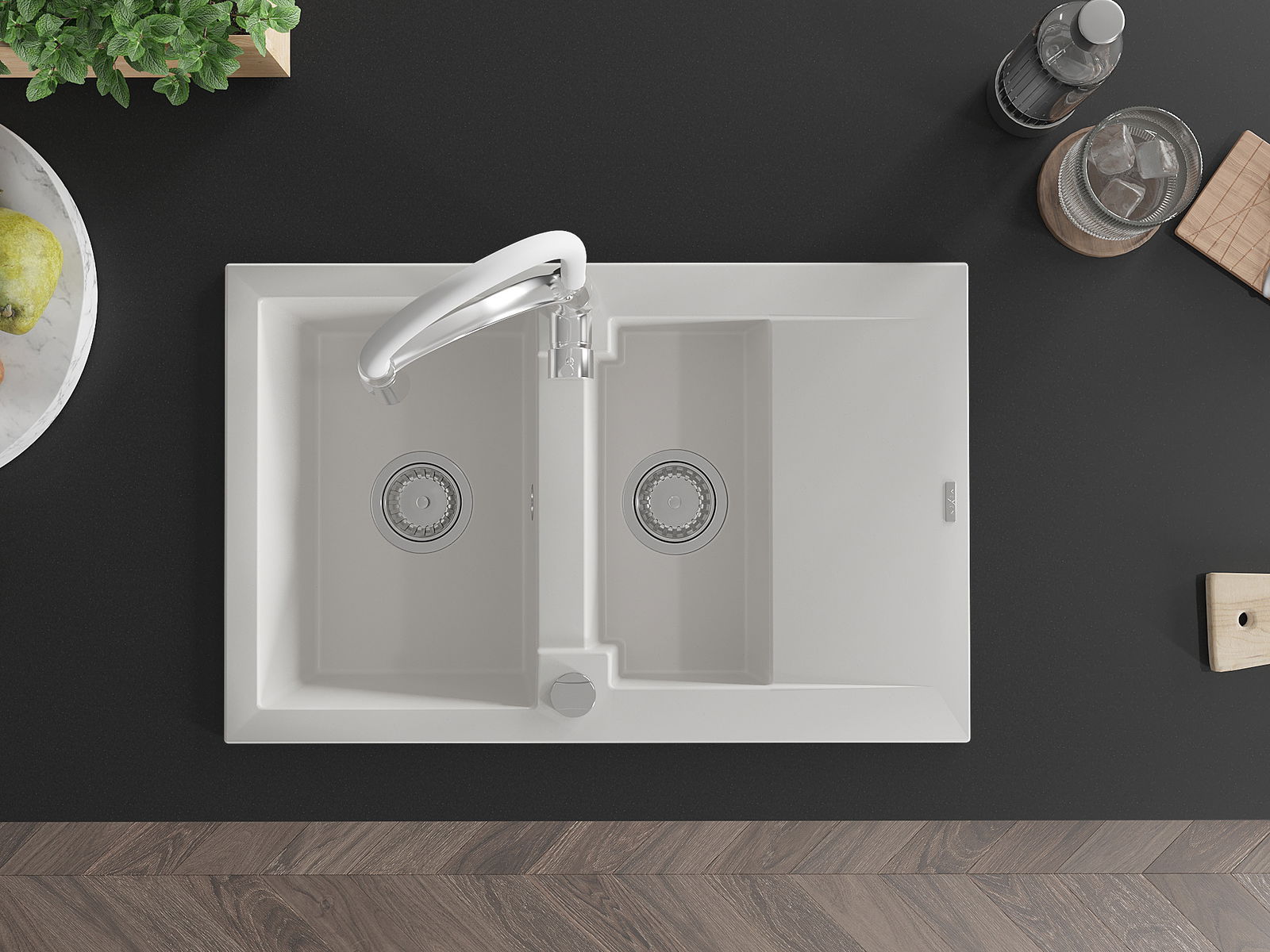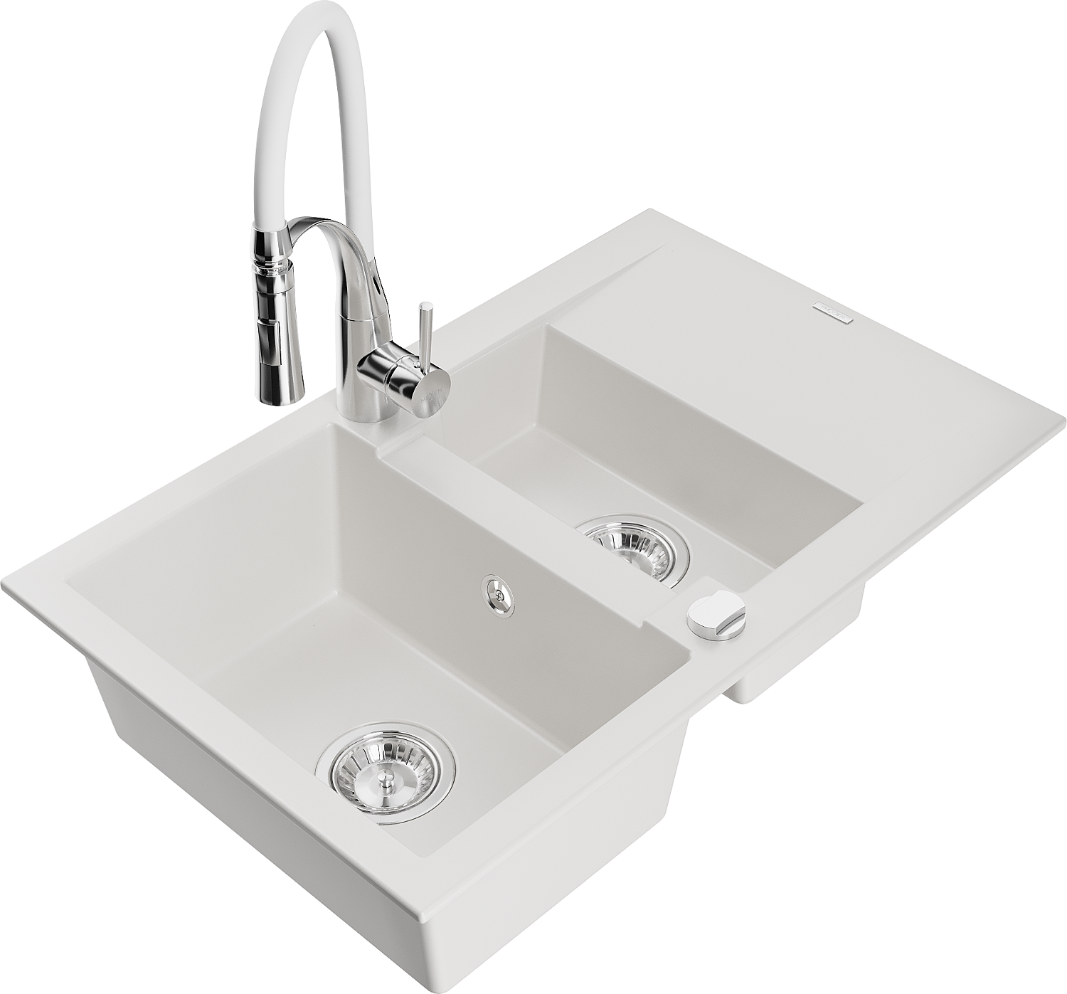 Mexen Gaspar granitový kuchyňský dřez 1,5 komorový s odkapávačem a kuchyňskou baterií Aster, bílý - 6507-20-73450-02