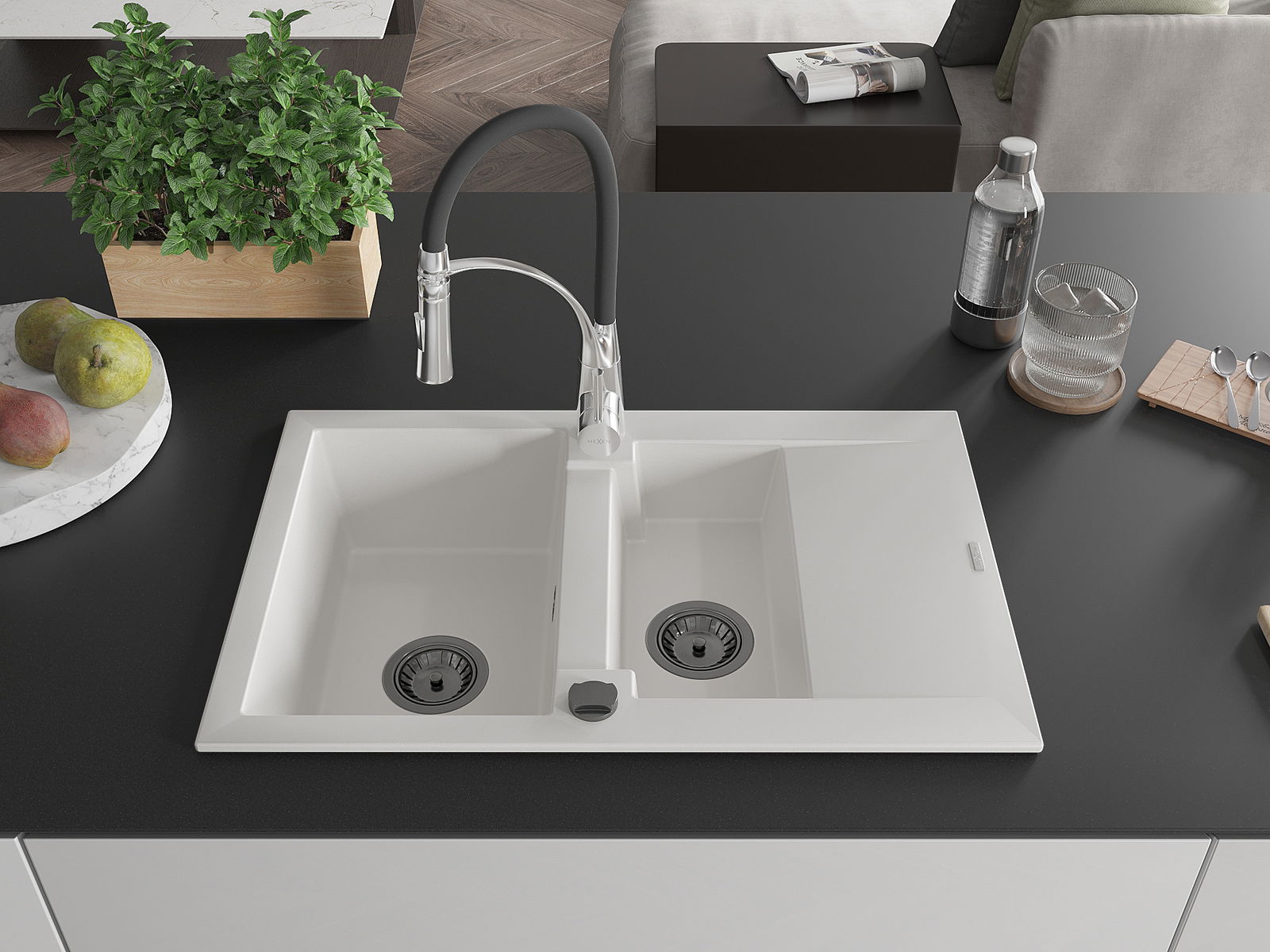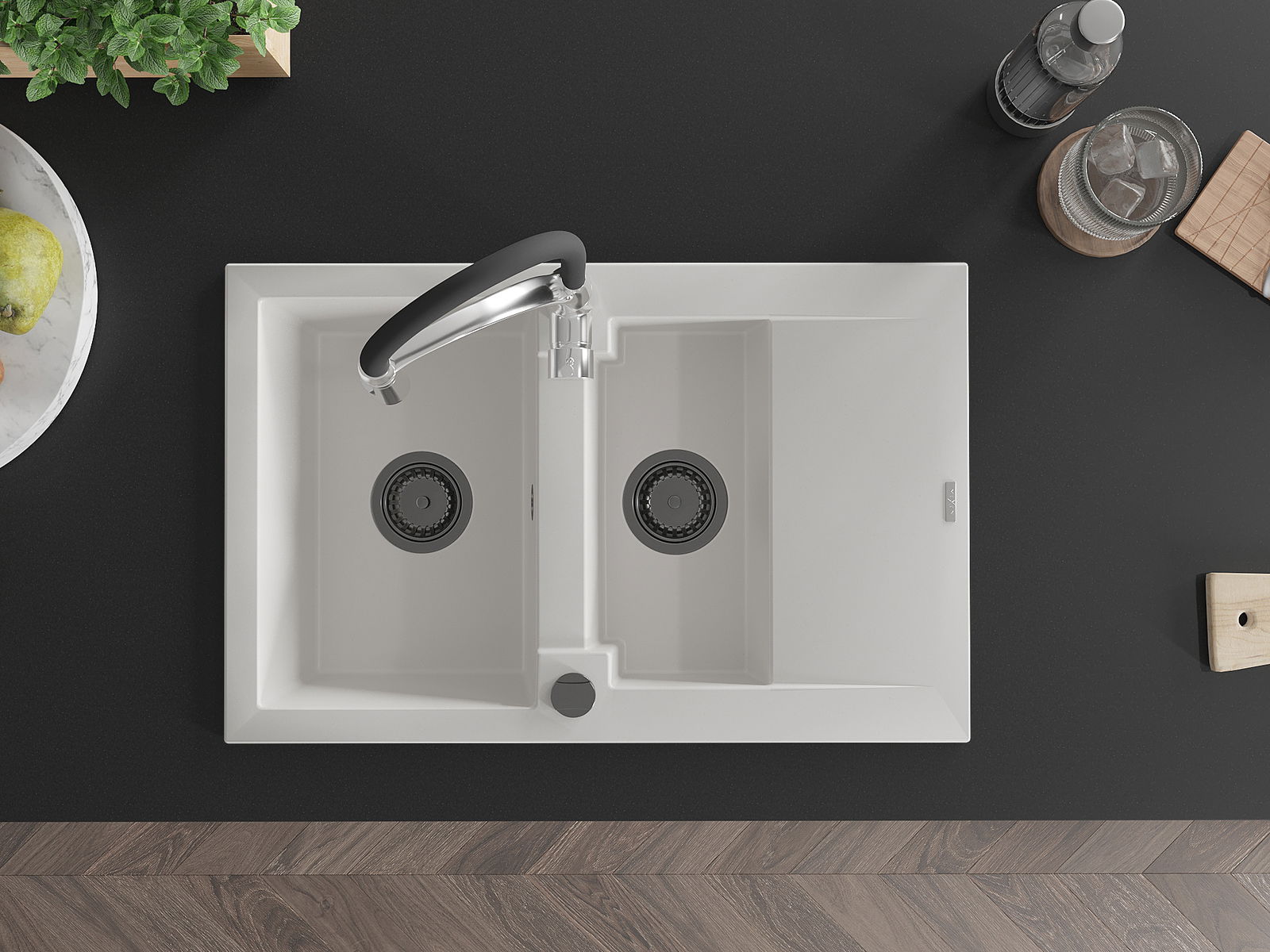 Mexen Gaspar granitový dřez 1,5komorový s odkapávačem a kuchyňskou baterií Aster, bílý - 6507-20-73450-07-B