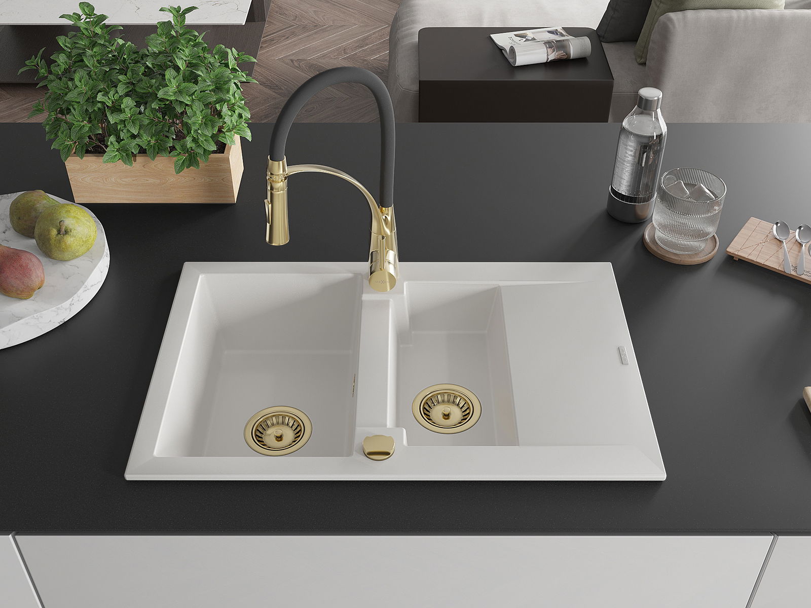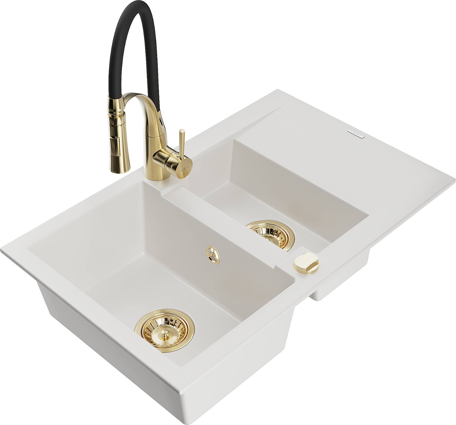 Mexen Gaspar granitový dřez 1,5-komorový s odkapávačem a kuchyňskou baterií Aster, bílý - 6507-20-73450-57-G