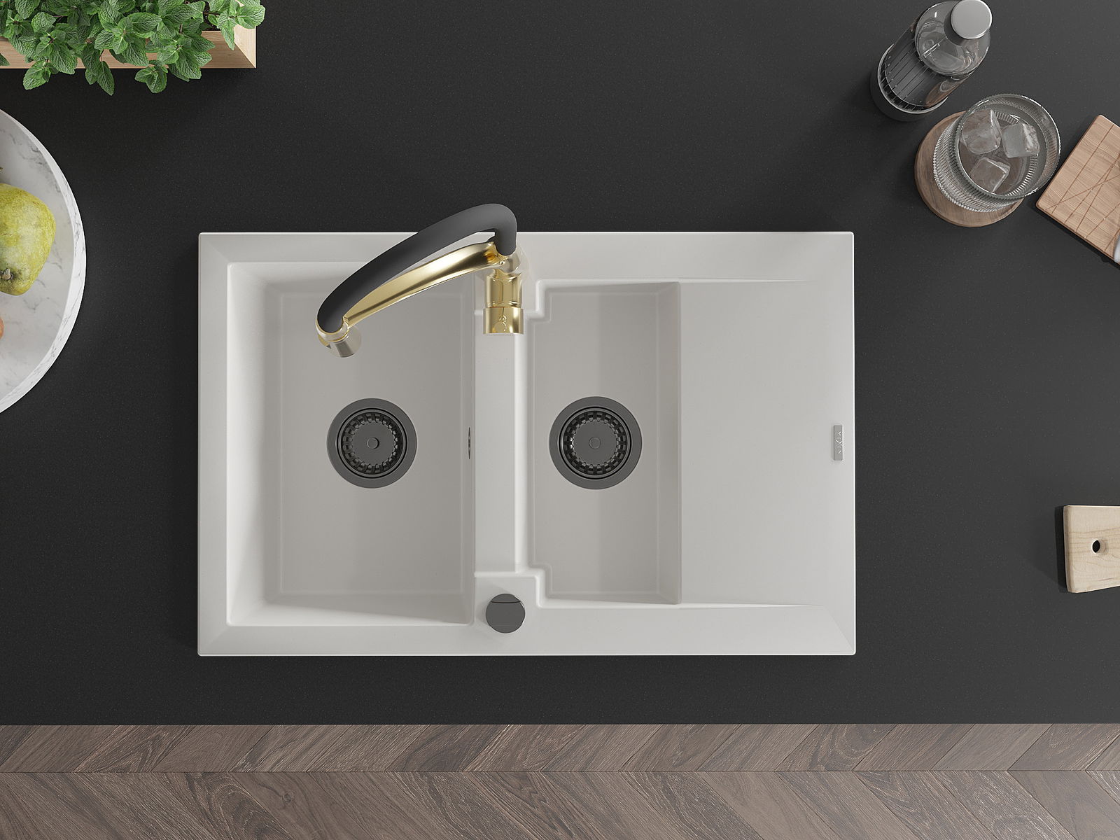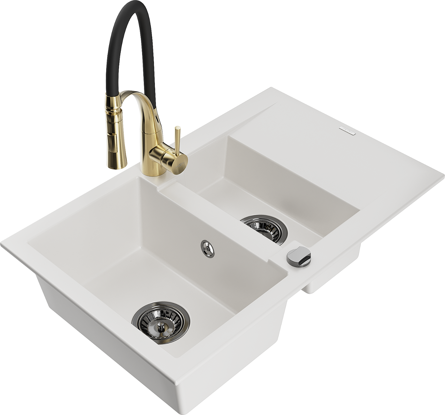 Mexen Gaspar žulový dřez 1,5-komorový s odkapávačem a kuchyňskou baterií Aster, bílý - 6507-20-73450-57-B