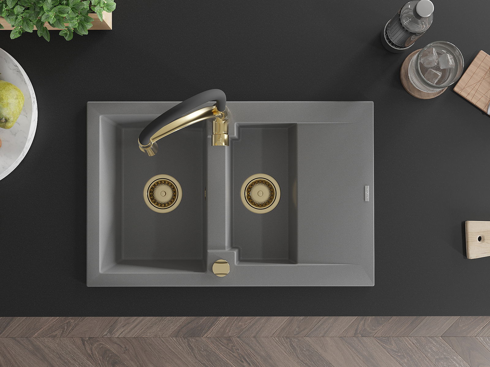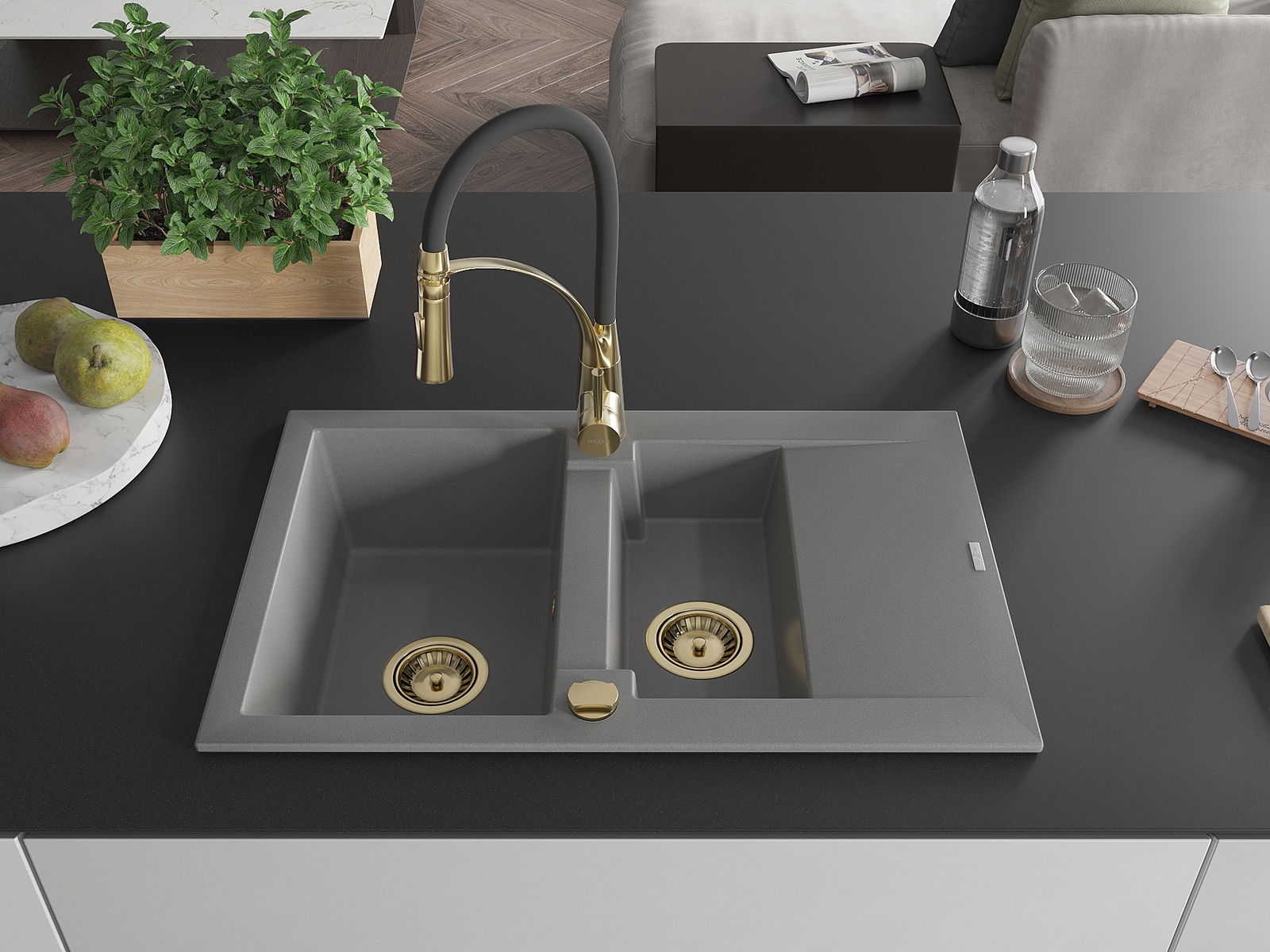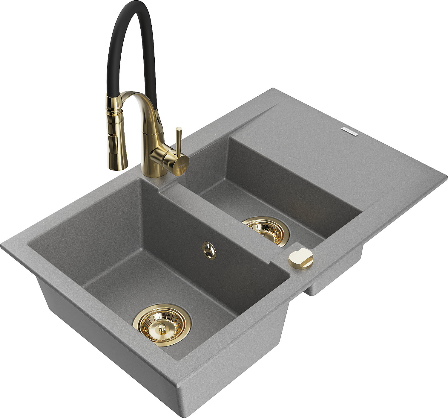 Mexen Gaspar granitový dřez 1,5komorový s odkapávačem a kuchyňskou baterií Aster, šedý - 6507-71-73450-57-G