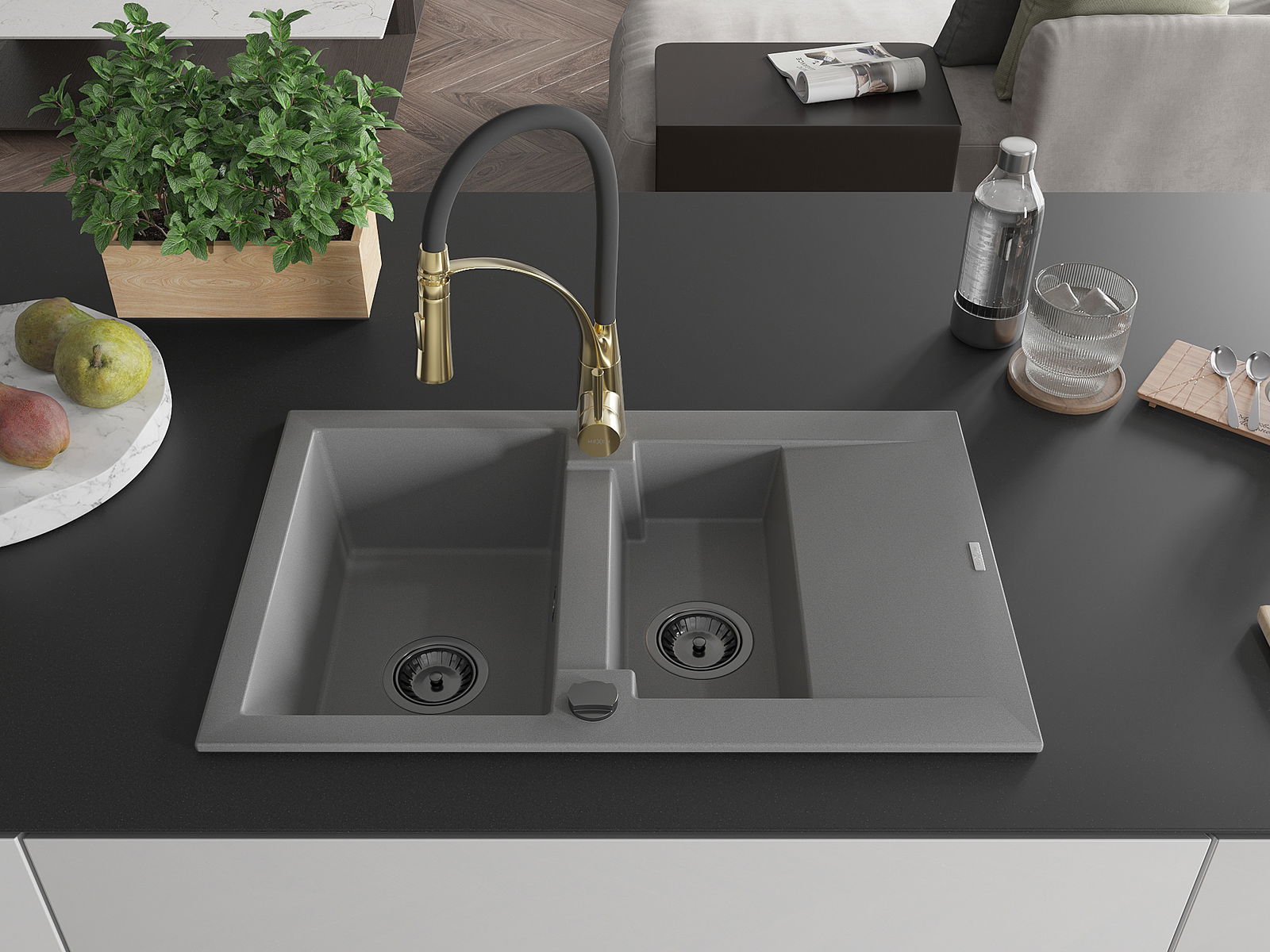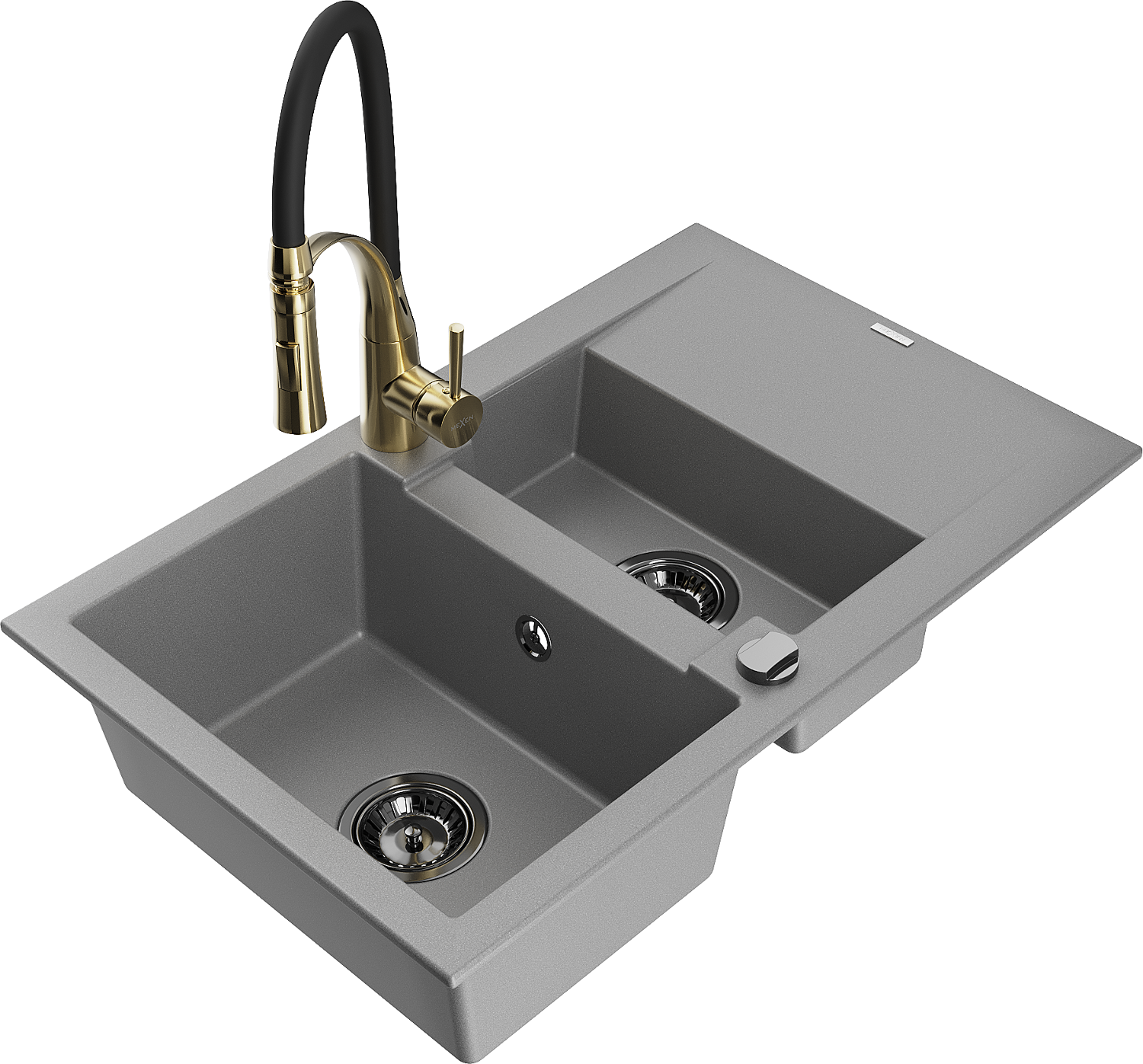 Mexen Gaspar granitový dřez 1,5-komorový s odkapávačem a kuchyňskou baterií Aster, šedý - 6507-71-73450-57-B