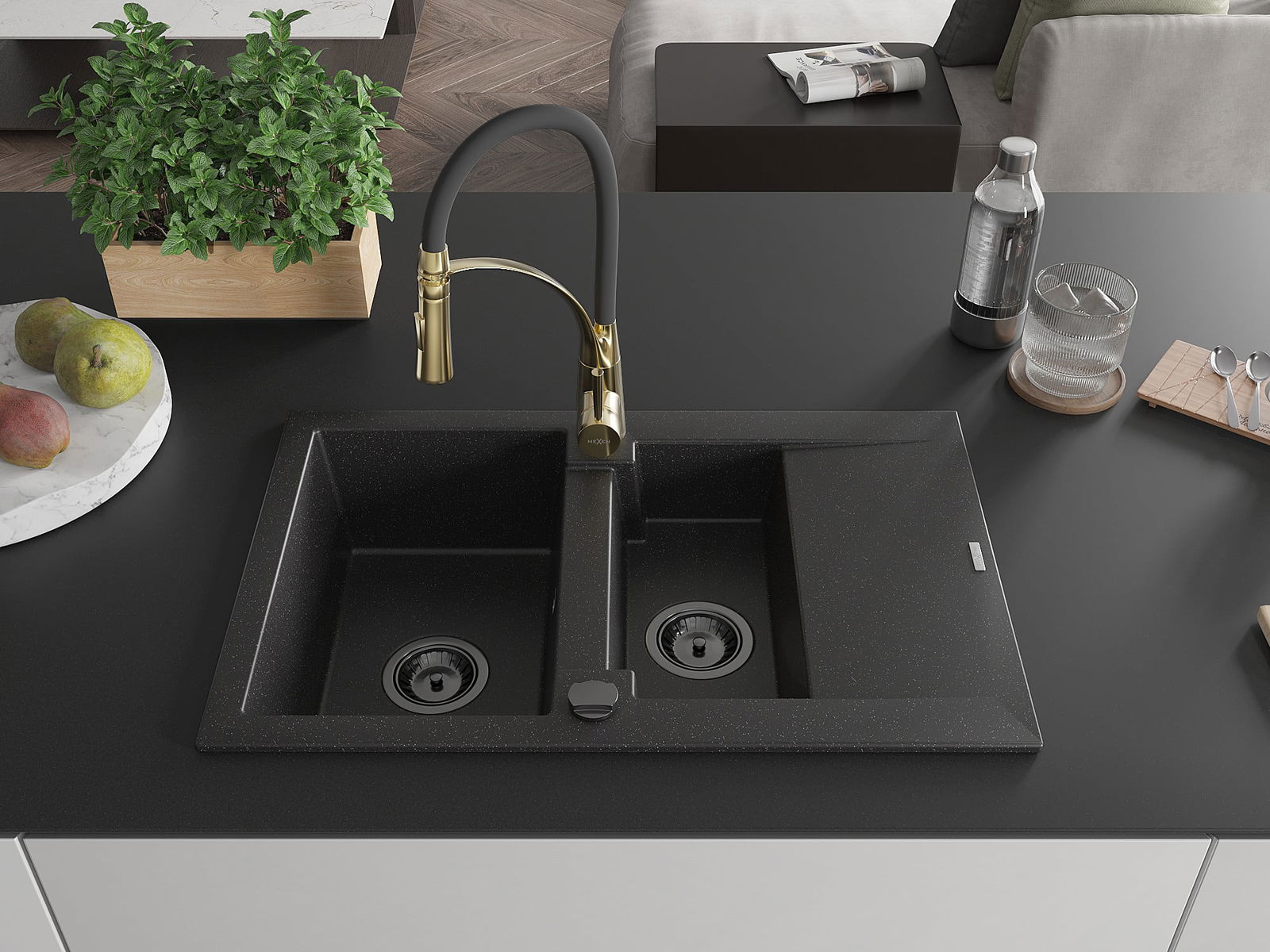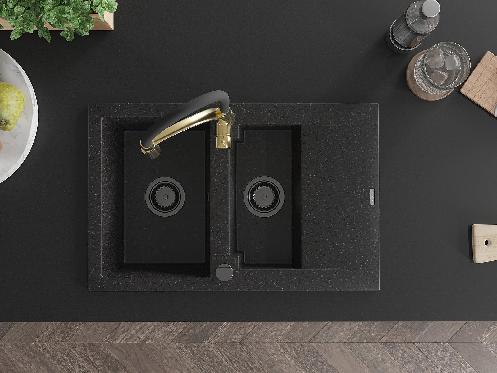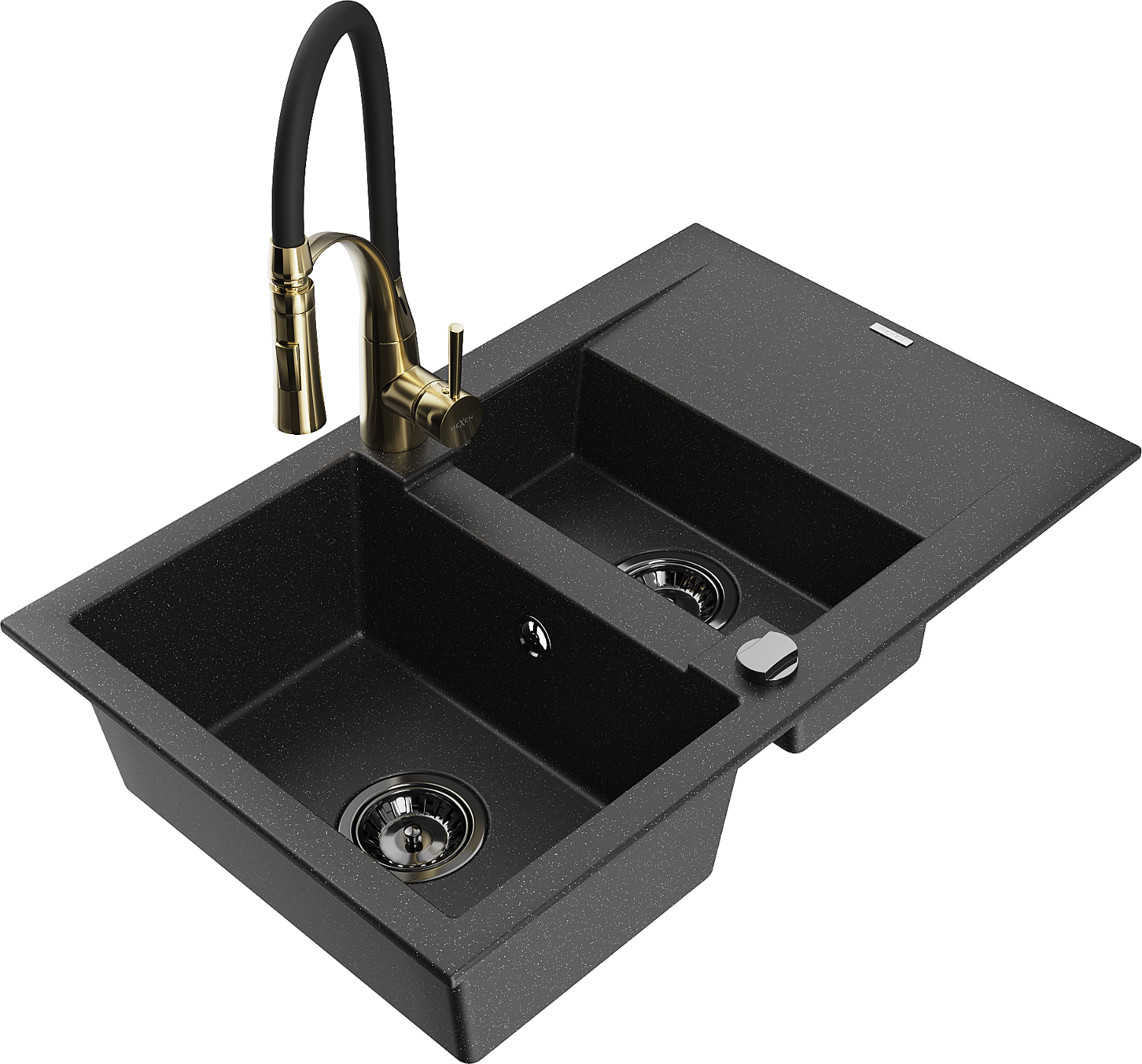 Mexen Gaspar granitový dřez 1,5-komorový s odkapávačem a kuchyňskou baterií Aster, černý/stříbrný - 6507-73-73450-57-B