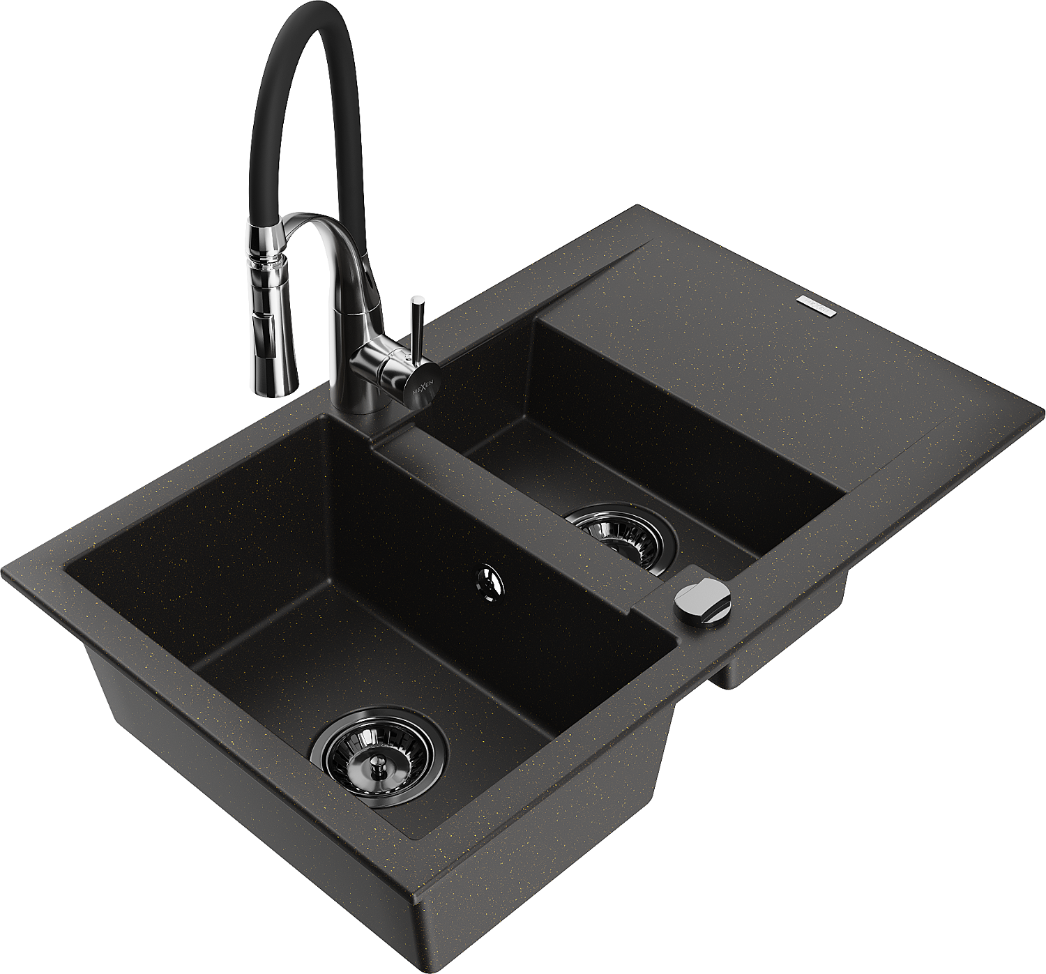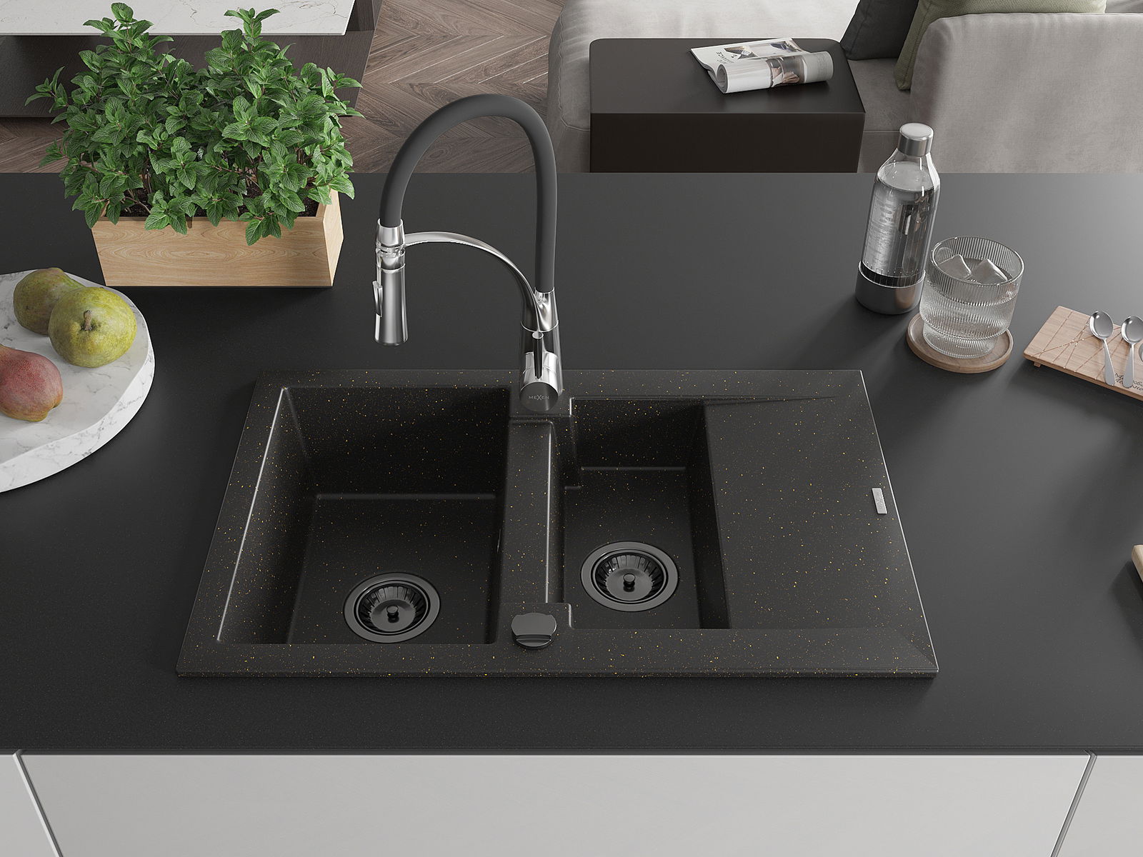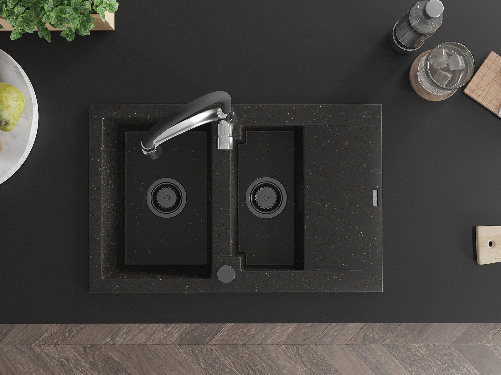 Mexen Gaspar granitový dřez 1,5komorový s odkapávačem a kuchyňskou baterií Aster, černý/zlatý metalik - 6507-75-73450-07-B