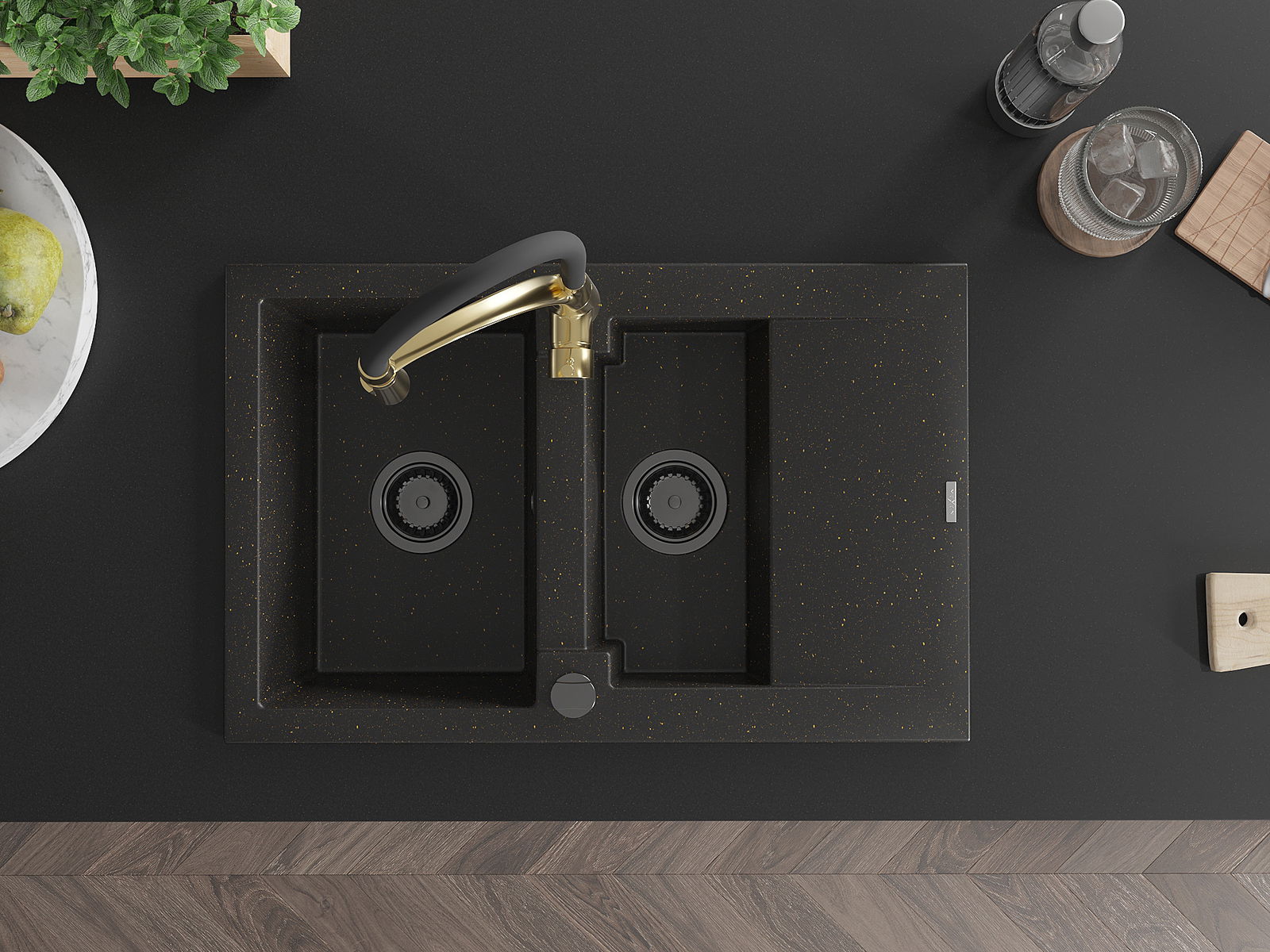 Mexen Gaspar žulový dřez 1,5-komorový s odkapávačem a kuchyňskou baterií Aster, černý/zlatý metalik - 6507-75-73450-57-B