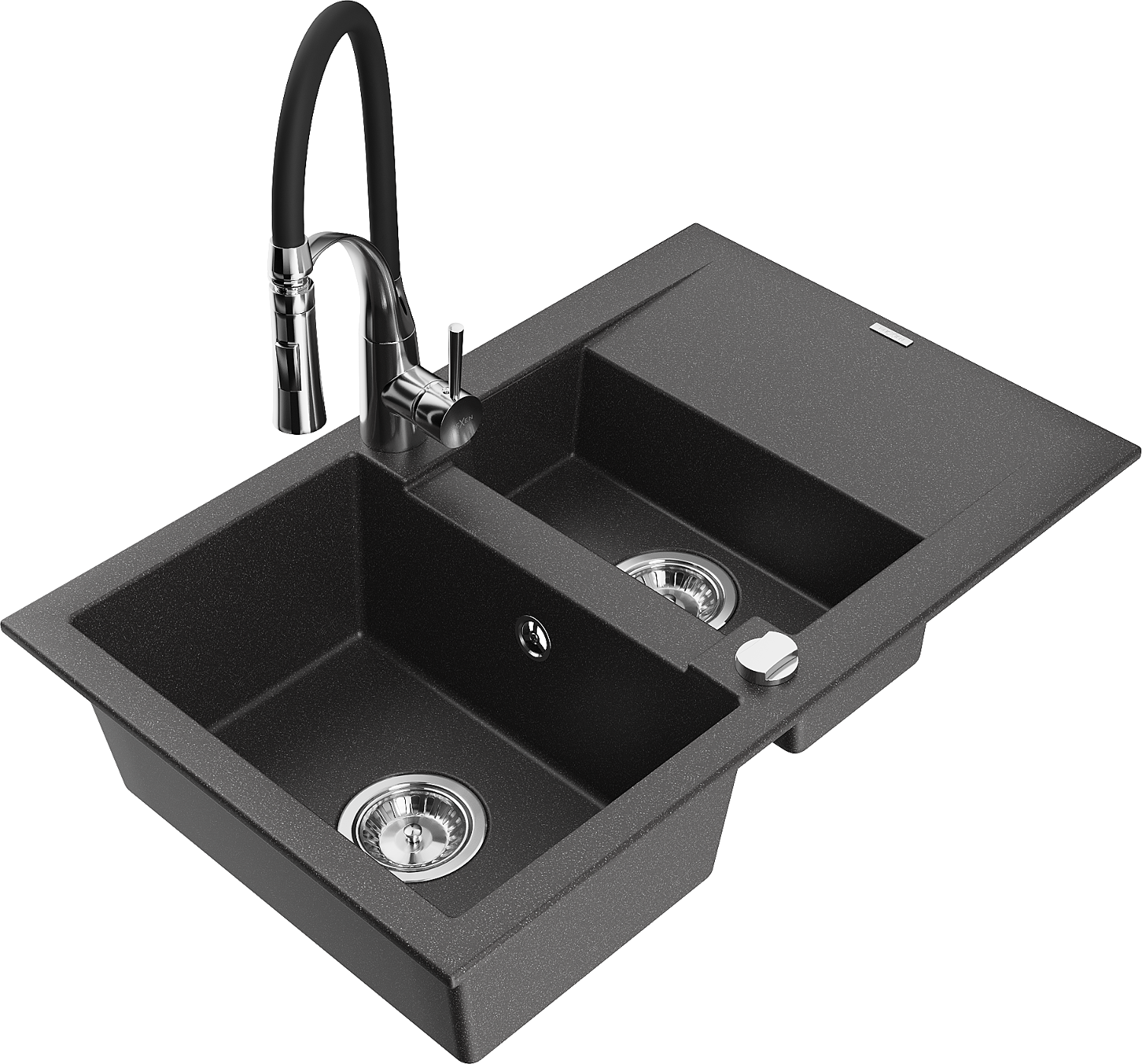 Mexen Gaspar granitový dřez 1,5-komorový s odkapávačem a kuchyňskou baterií Aster, černý skvrnitý - 6507-76-73450-07