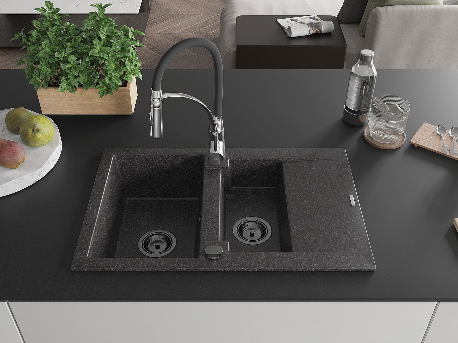 Mexen Gaspar granitový dřez 1,5-komorový s odkapávačem a kuchyňskou baterií Aster, černý skvrnitý - 6507-76-73450-07-B