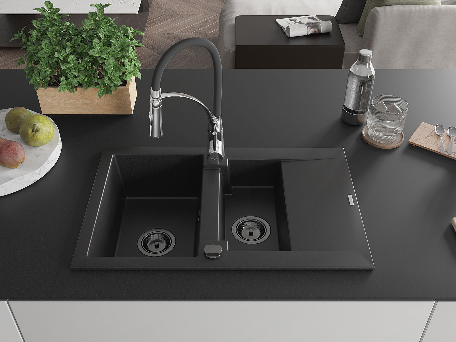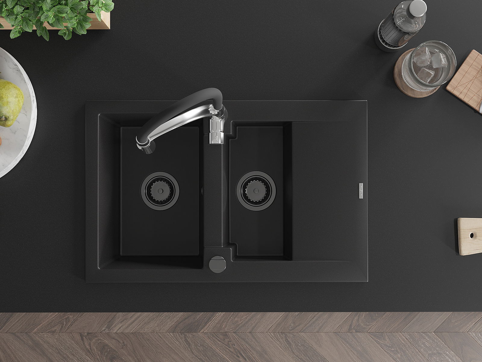 Mexen Gaspar dřez z granitu 1,5-komorový s odkapávačem a kuchyňskou baterií Aster, černý - 6507-77-73450-07-B