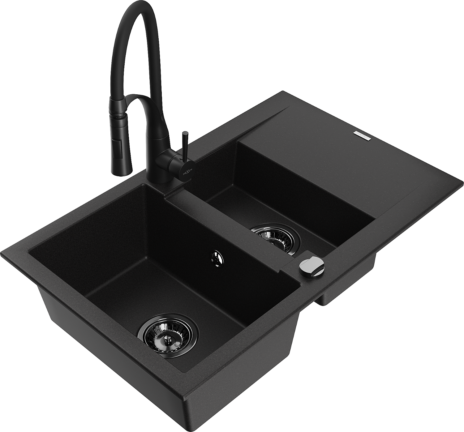 Mexen Gaspar žulový dřez 1,5-komorový s odkapávačem a kuchyňskou baterií Aster, černý - 6507-77-73450-70-B