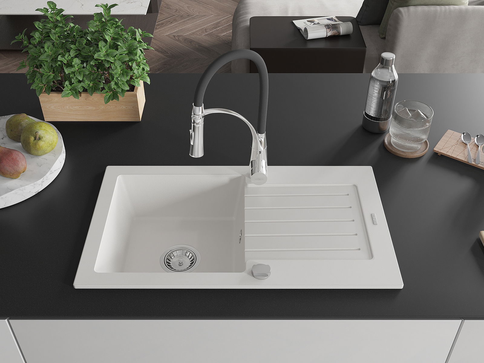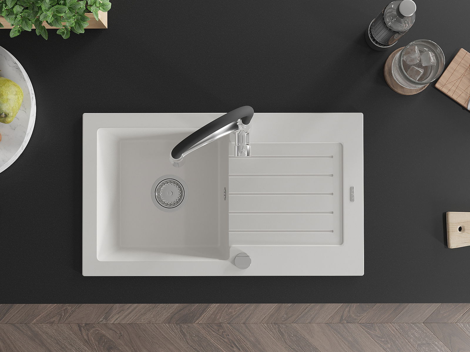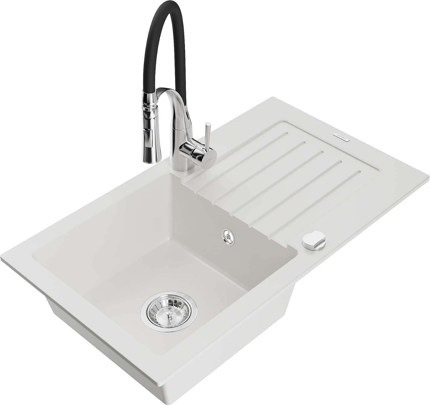 Mexen Pablo granitový dřez s jednou komorou a odkapávačem a kuchyňskou baterií Aster, bílý - 6510-20-73450-07