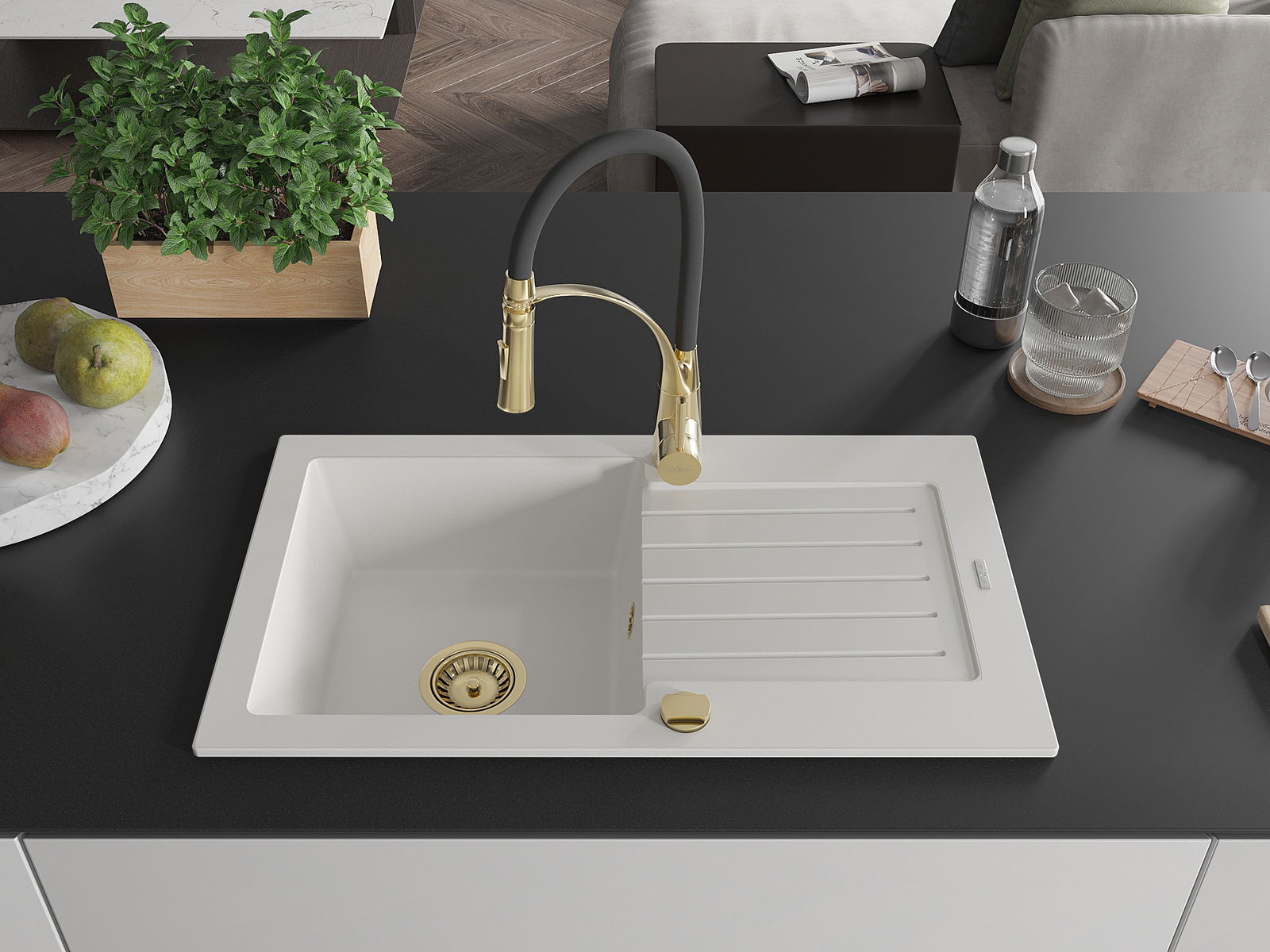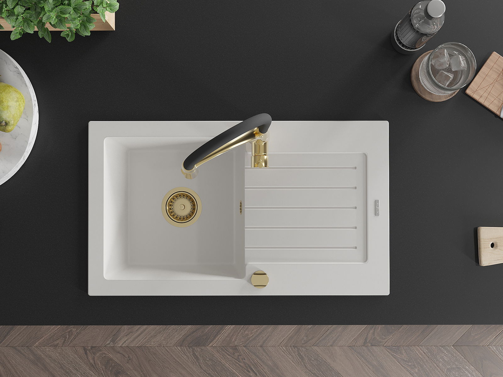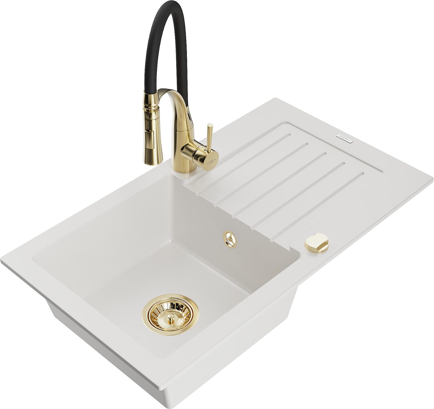 Mexen Pablo granitový dřez s 1 komorou, odkapávačem a kuchyňskou baterií Aster, bílý - 6510-20-73450-57-G