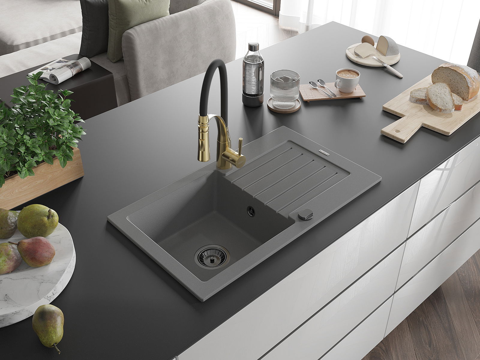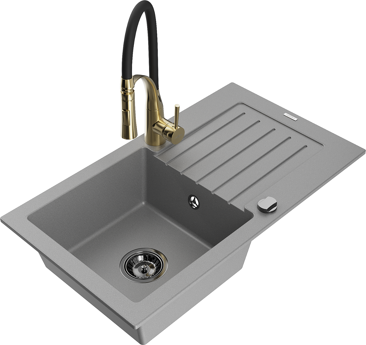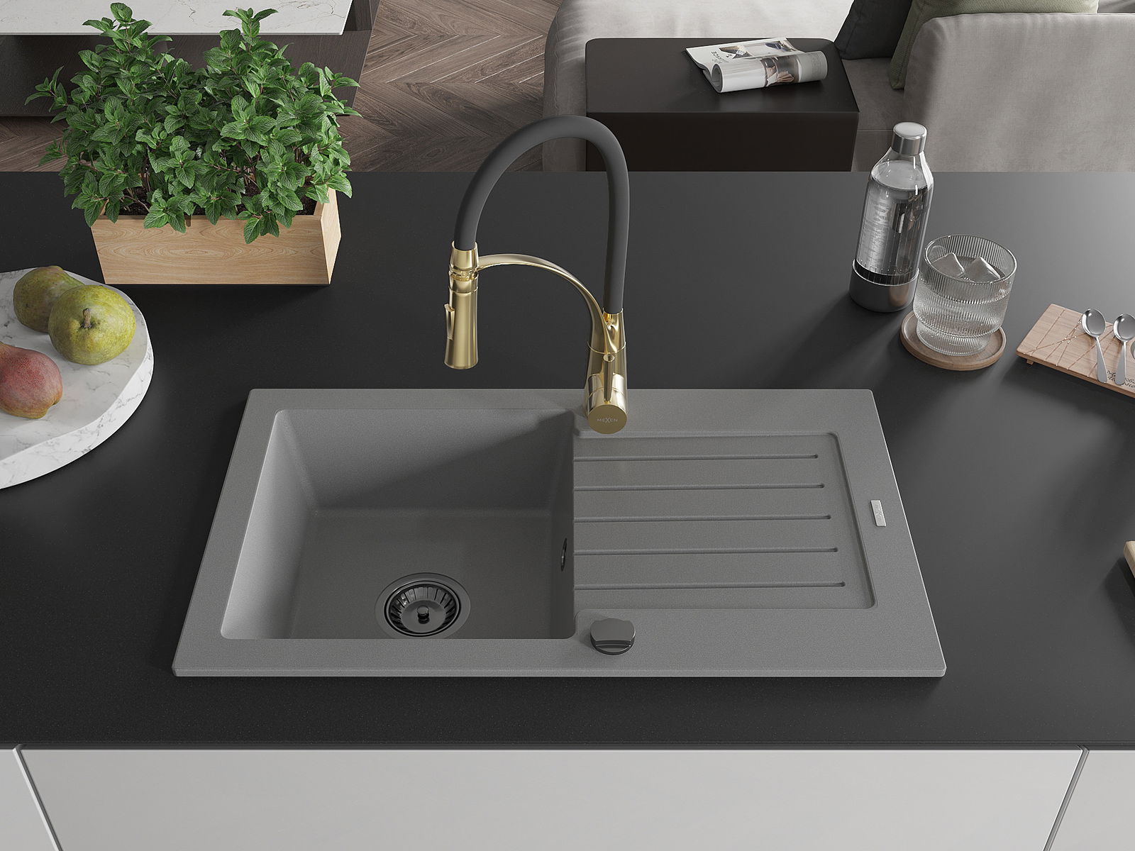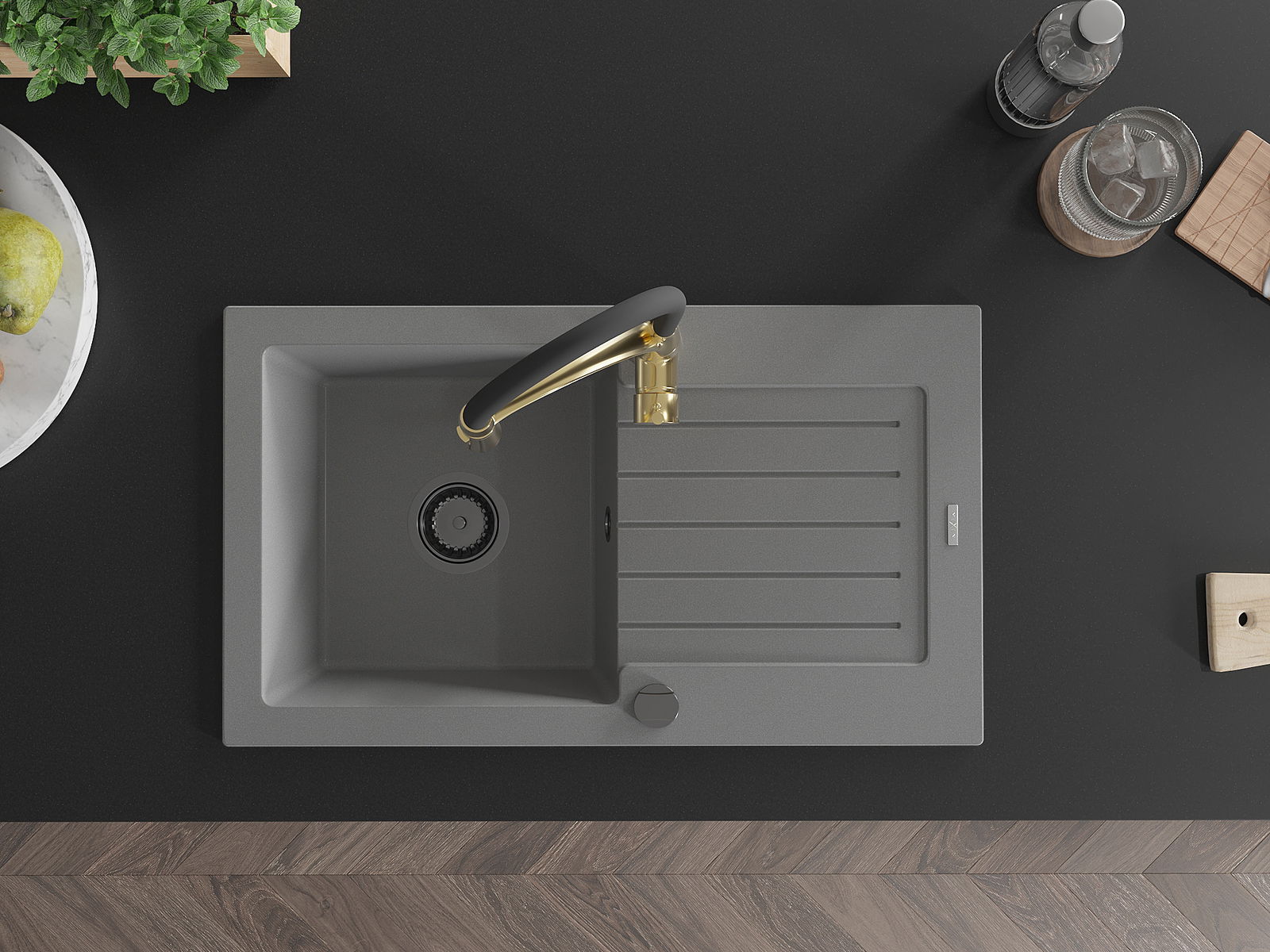 Mexen Pablo granitový kuchyňský dřez 1-komorový s odkapávačem a kuchyňskou baterií Aster, šedý - 6510-71-73450-57-B