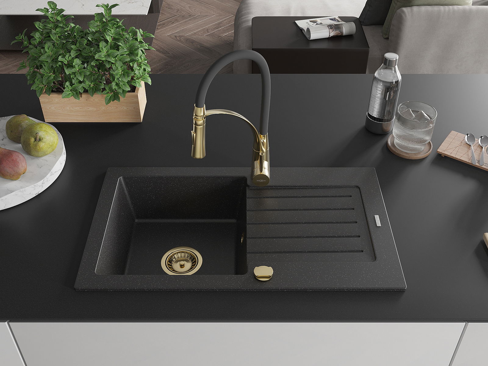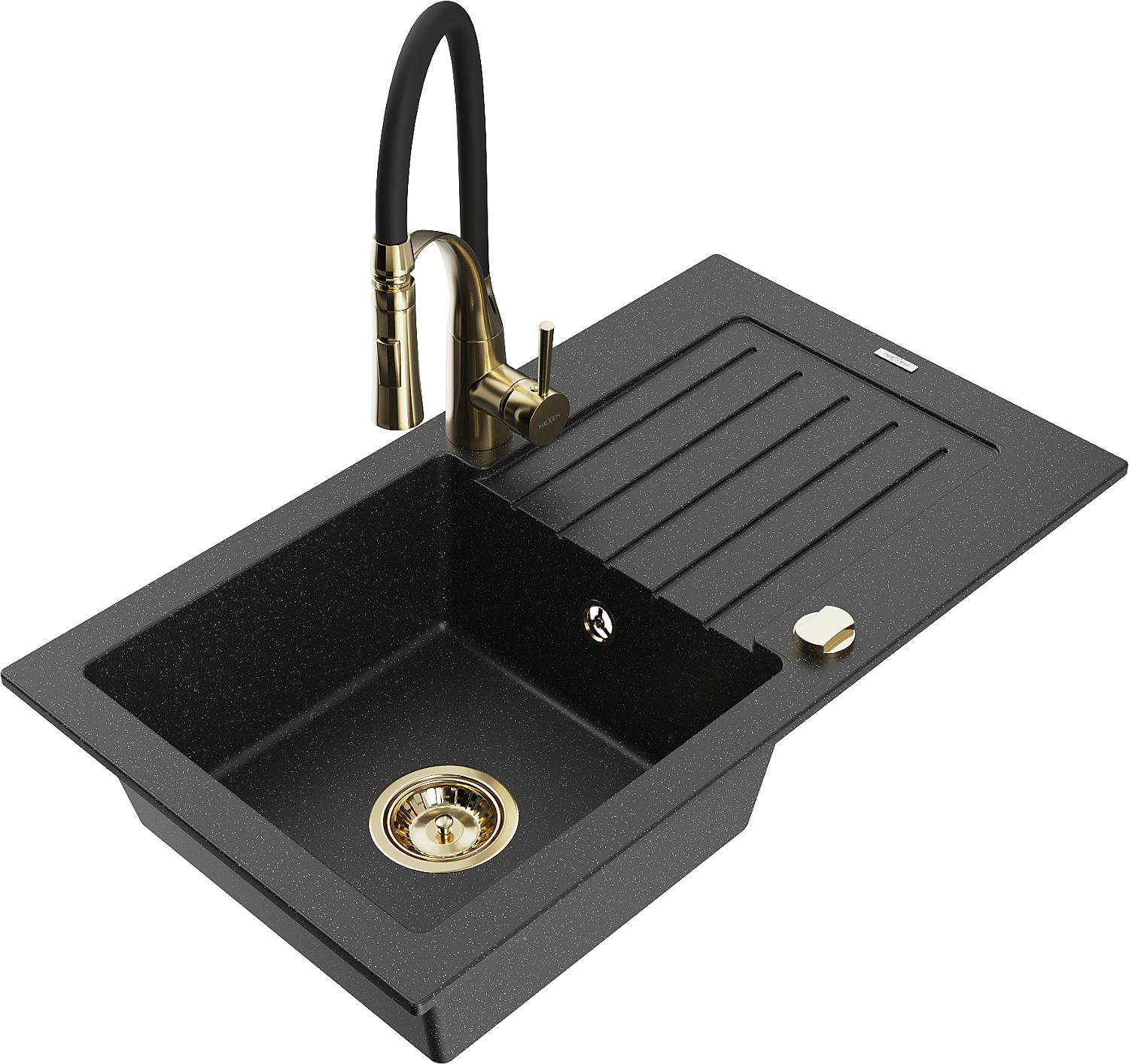 Mexen Pablo granitový dřez 1-komorový s odkapávačem a kuchyňskou baterií Aster, černý/stříbrný metalik - 6510-73-73450-57-G
