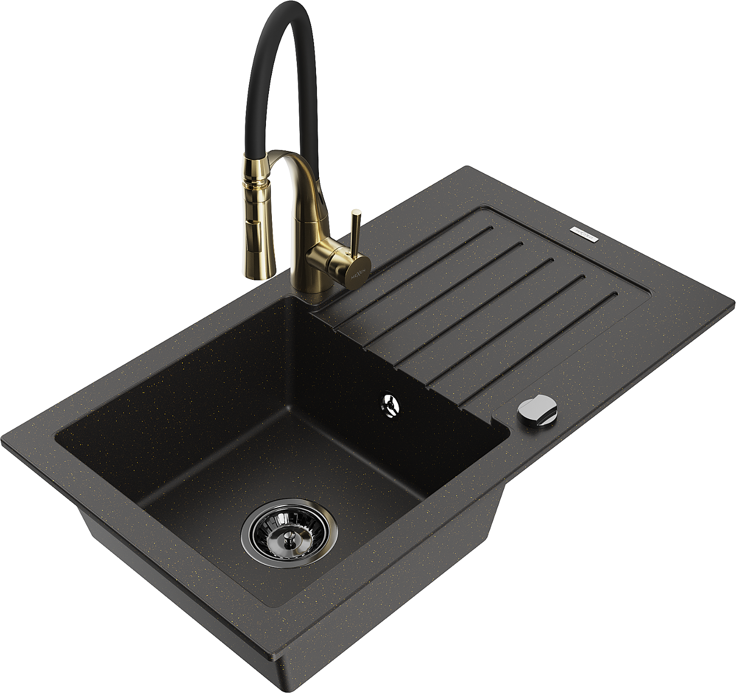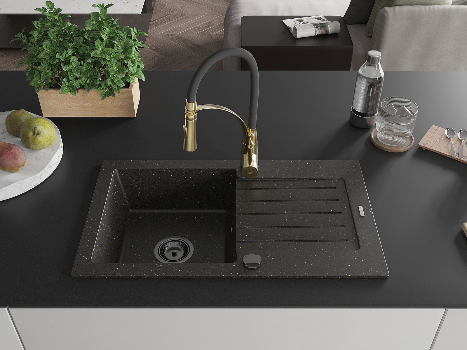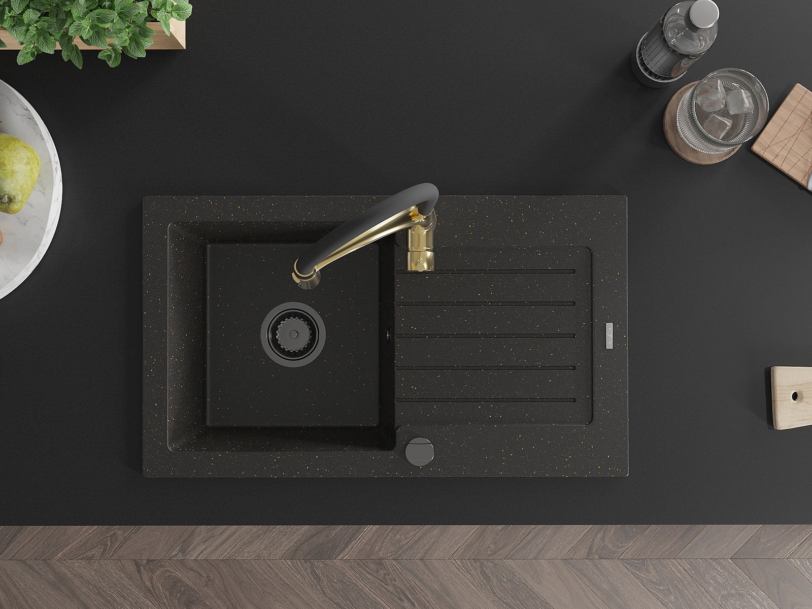 Mexen Pablo granitový dřez s 1 komorou, odkapávačem a kuchyňskou baterií Aster, černý/zlatý metalik - 6510-75-73450-57-B
