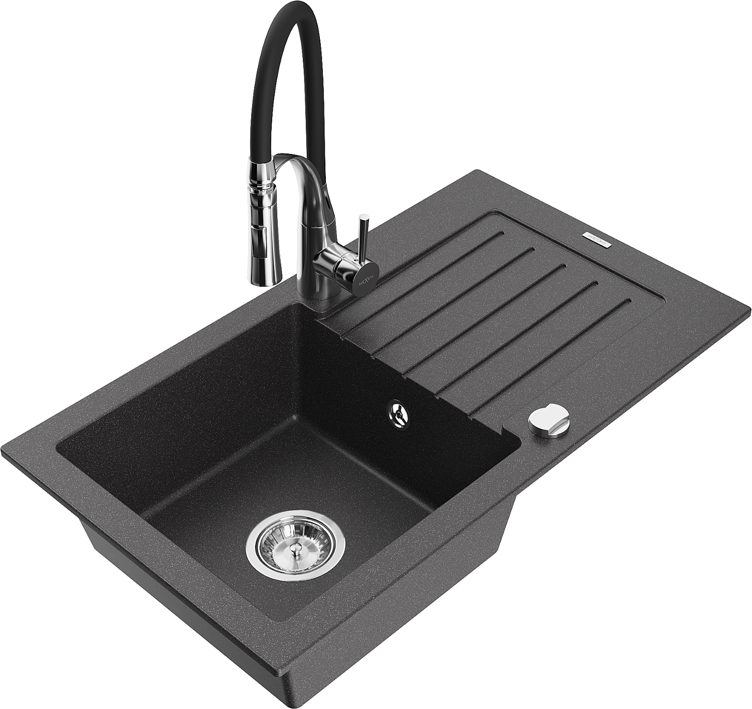 Mexen Pablo granitový dřez 1-komorový s odkapávačem a kuchyňskou baterií Aster, černý skvrnitý - 6510-76-73450-07