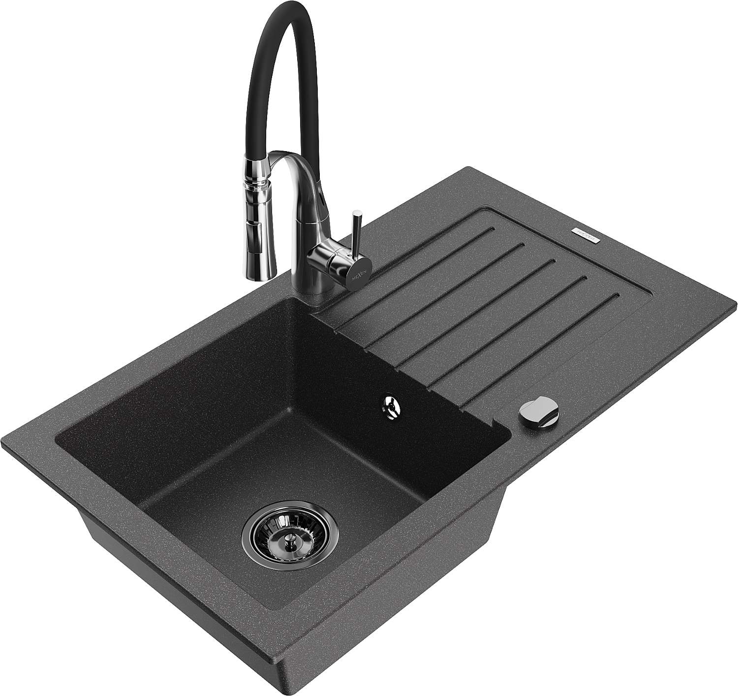 Mexen Pablo granitový dřez 1-komorový s odkapávačem a kuchyňskou baterií Aster, černý nakrapovaný - 6510-76-73450-07-B