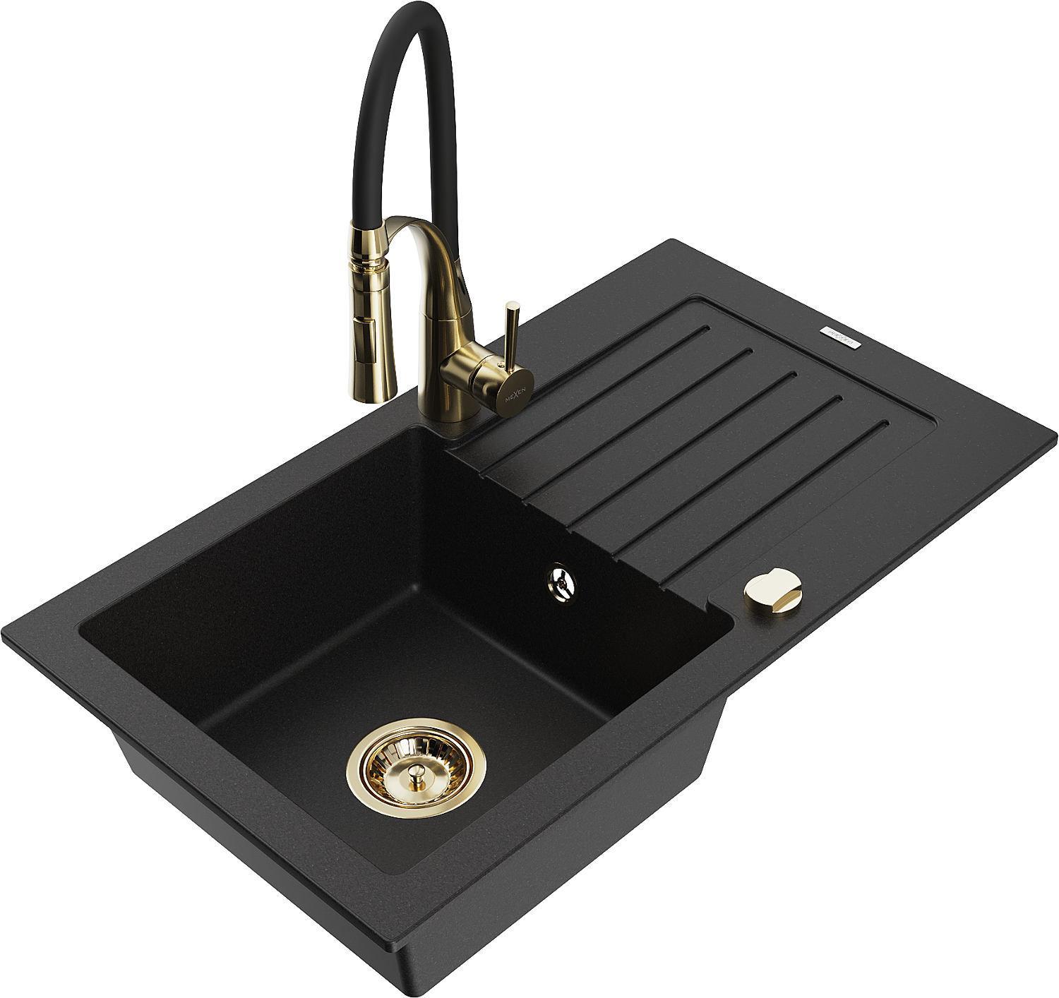 Mexen Pablo granitový dřez 1-komorový s odkapávačem a kuchyňskou baterií Aster, černý - 6510-77-73450-57-G