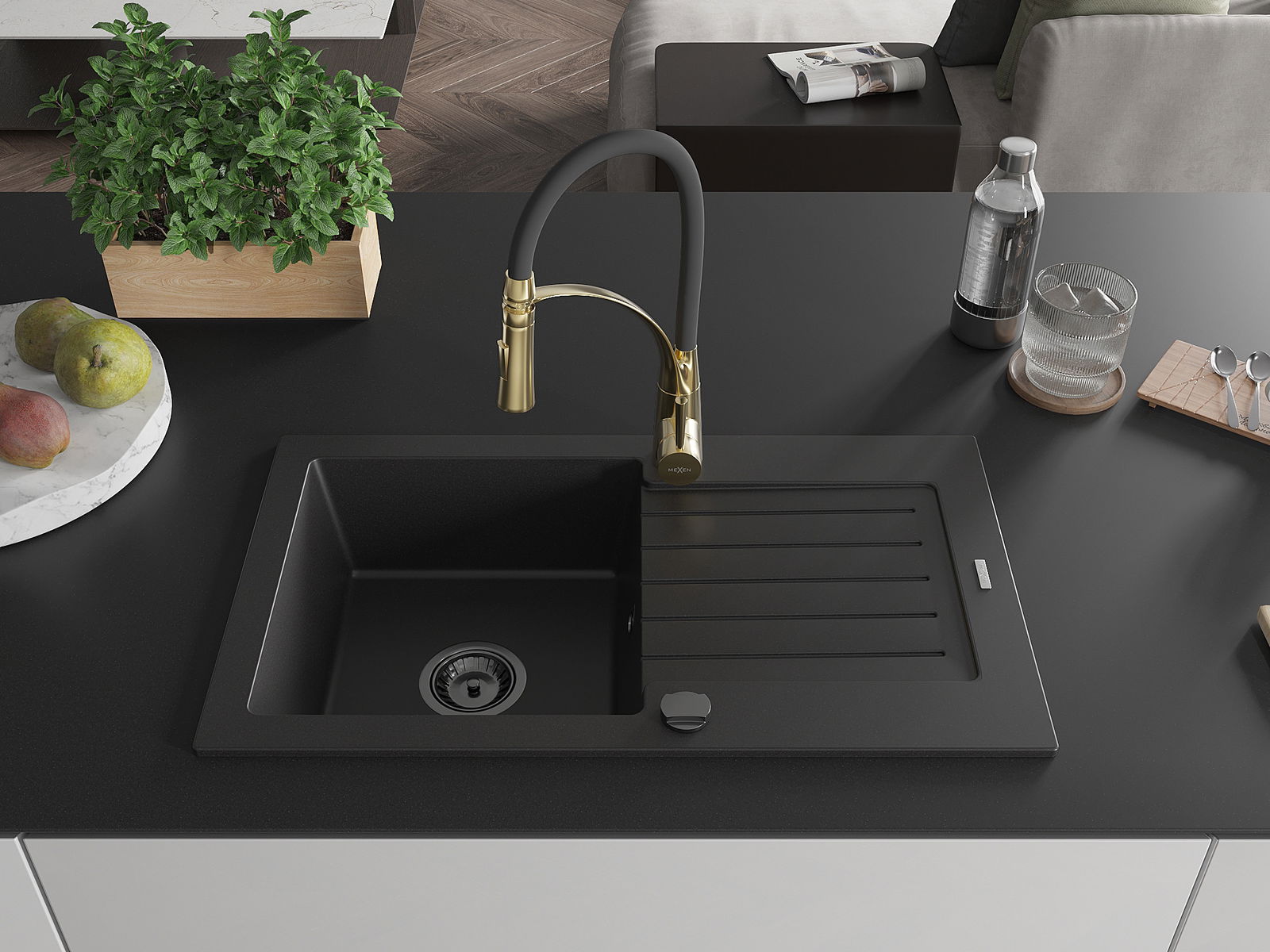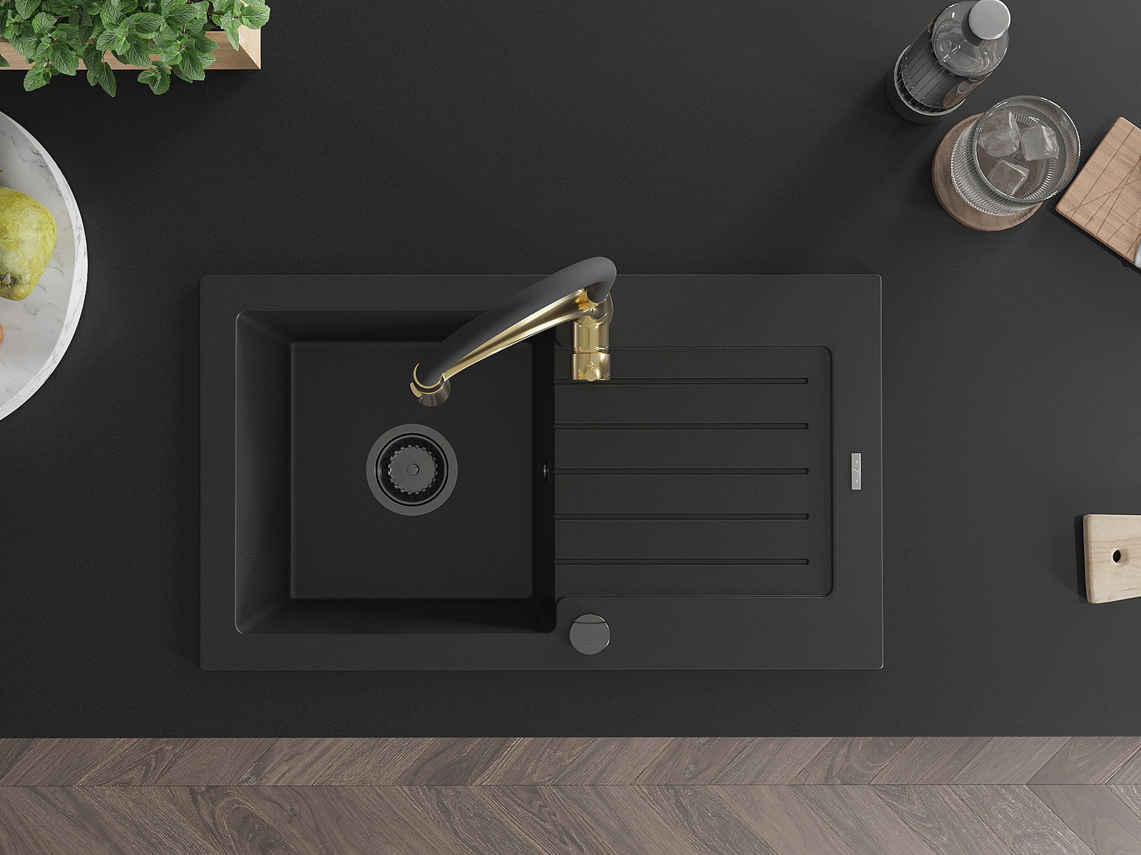 Mexen Pablo granitový dřez s jednou komorou a odkapávačem a kuchyňskou baterií Aster, černý - 6510-77-73450-57-B