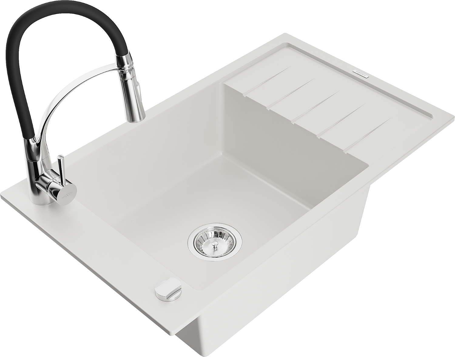Mexen Elias granitový dřez 1-komorový s odkapávačem a kuchyňskou baterií Aster, bílý - 6511-20-73450-07