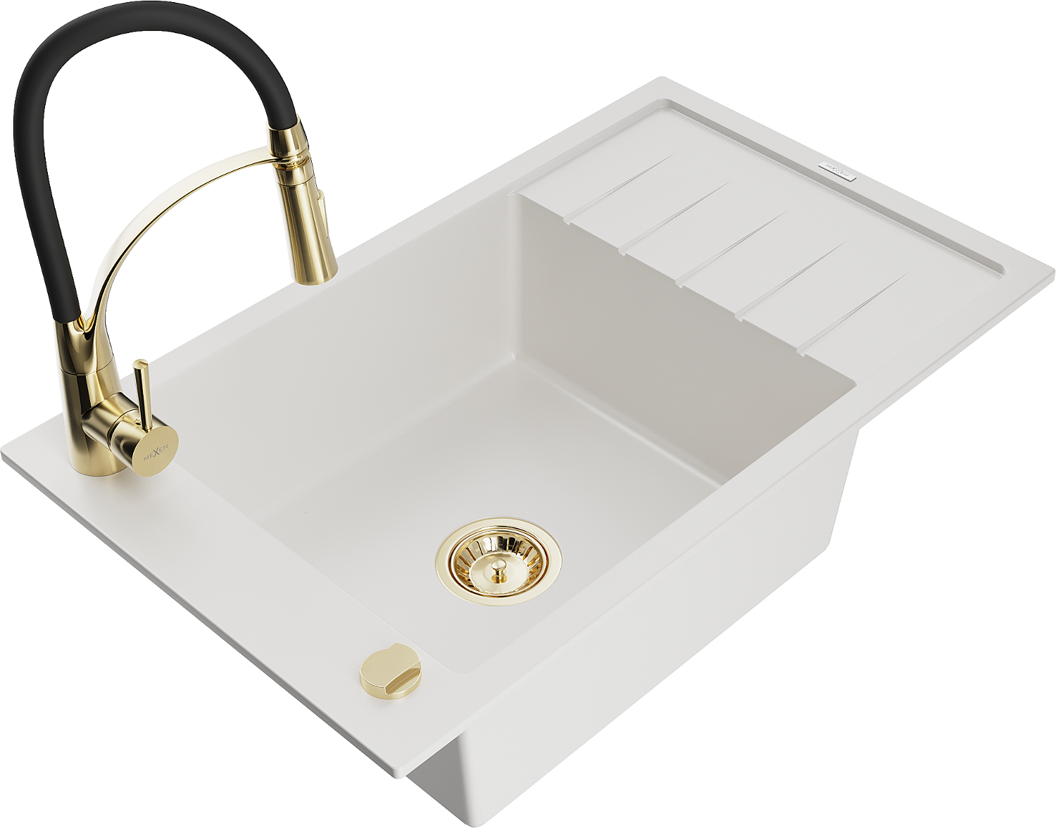 Mexen Elias granitový dřez 1-komorový s odkapávačem a kuchyňskou baterií Aster, bílý - 6511-20-73450-57-G