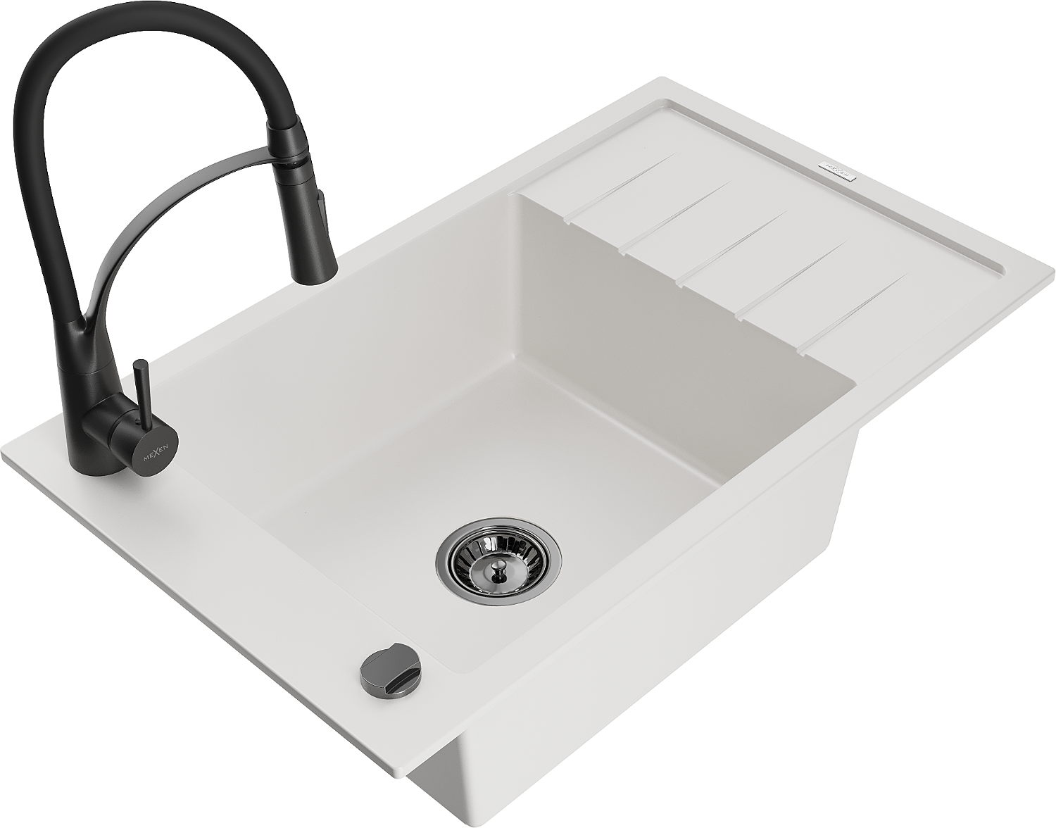 Mexen Elias granitový dřez 1-komorový s odkapávačem a kuchyňskou baterií Aster, bílá - 6511-20-73450-70-B