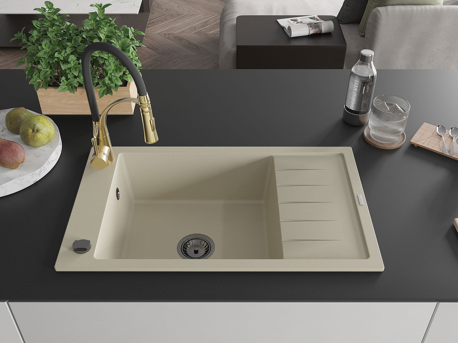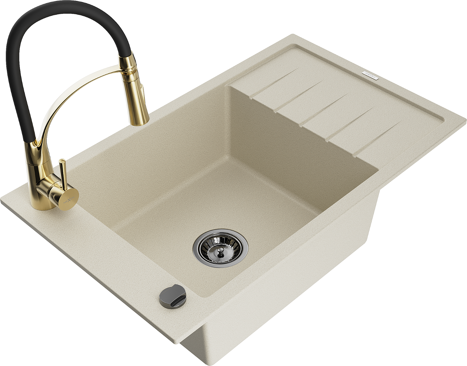 Mexen Elias granitový dřez 1-komorový s odkapávačem a kuchyňskou baterií Aster, béžový - 6511-69-73450-57-B