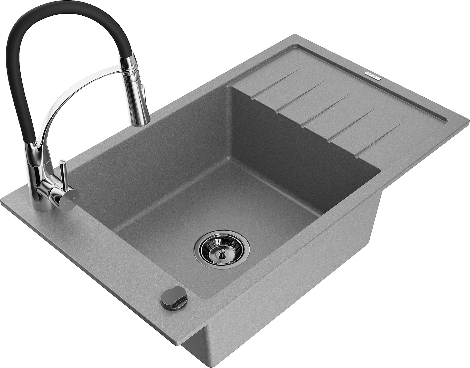 Mexen Elias granitový dřez 1-komorový s odkapávačem a kuchyňskou baterií Aster, šedý - 6511-71-73450-07-B