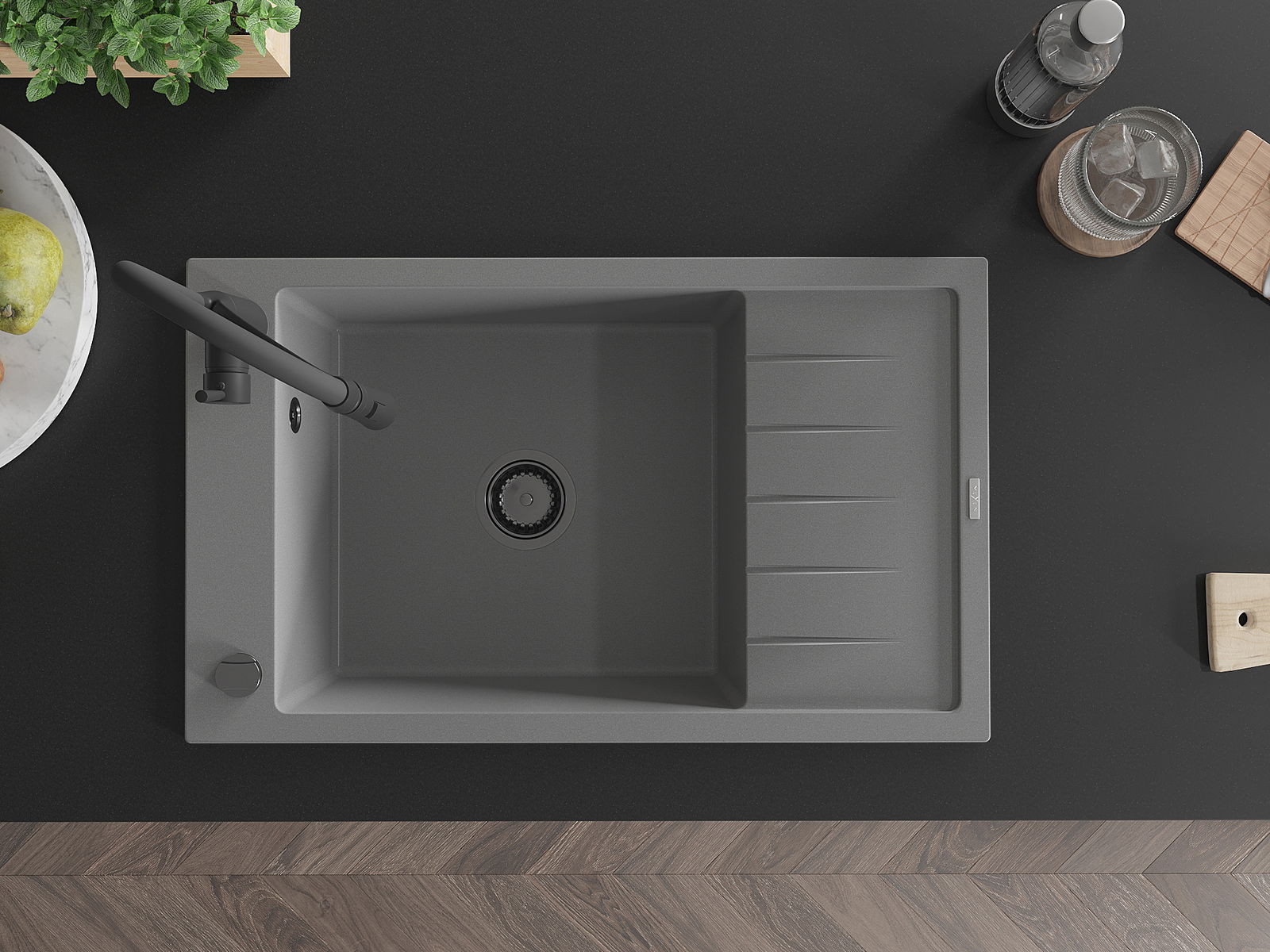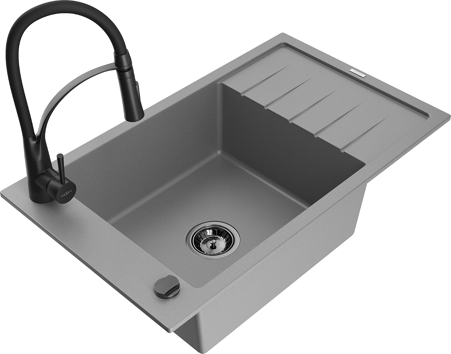 Mexen Elias granitový jednodřezu s odkapávačem a kuchyňskou baterií Aster, šedý - 6511-71-73450-70-B