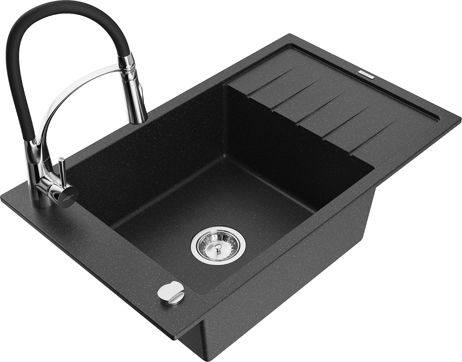 Mexen Elias granitový dřez 1-komorový s odkapávačem a kuchyňskou baterií Aster, černý/stříbrný metalik - 6511-73-73450-07