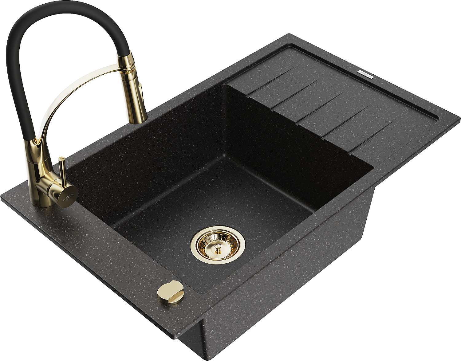 Mexen Elias granitový dřez 1-komorový s odkapávačem a kuchyňskou baterií Aster, černý/stříbrný metalík - 6511-73-73450-57-G