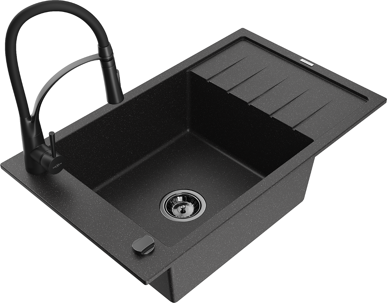Mexen Elias granitový dřez s 1 komorou a odkapávačem a kuchyňskou baterií Aster, černý/stříbrný metalik - 6511-73-73450-70-B