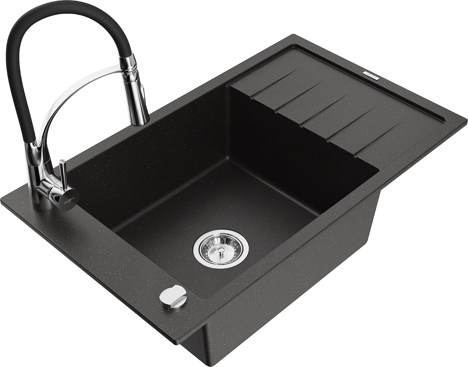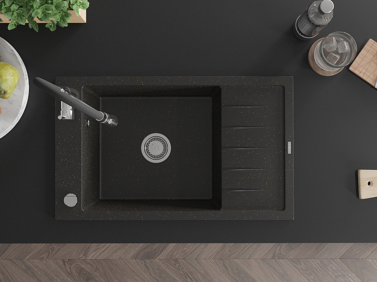 Mexen Elias granitový dřez 1-komorový s odkapávačem a kuchyňskou baterií Aster, černý/zlatý metalik - 6511-75-73450-70