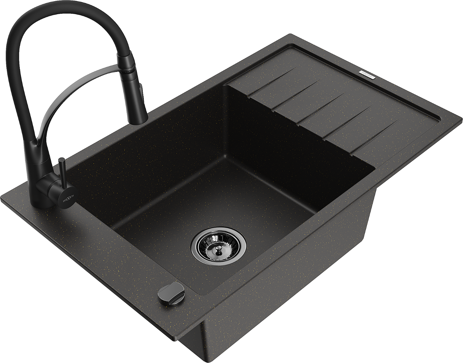 Mexen Elias granitový dřez 1-komorový s odkapávačem a kuchyňskou baterií Aster, černý/zlatý metalík - 6511-75-73450-70-B